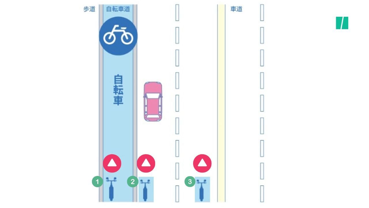 報道やSNSでも度々、交通ルール違反が問題視されている 「電動キックボード」 。 ハフポスト日本版では、安全な利用のために知っておきたい“正しい交通ルール”を、クイズ形式で出題しています。 今回のテーマは、 「自転車道」 がある道路の走り方について。 次の図では、3台の電動キックボードが走っています。さて、この中で交通ルール違反をしているのはどれでしょうか。 【あわせて読みたい】写真の電動キックボード3台、「違反」はどれ?超基本の「走り方」、交通ルールをおさらい【クイズ】 どのキックボードが交通違反になる? 正解は? まず、自転車道についておさらいします。 警視庁 によると、自転車道とは「縁石や柵などによって区画された車道部分」のことをいいます。 普通自転車は原則、自転車道が設けられている道路ではここを通行しなければなりません。 では、 「特定小型原動機付自転車」 に定義される電動キックボードはどこを走ればよいのでしょうか。 大前提として、車道と歩道・路側帯の区別がある場所では、特定小型原動機付自転車は車道を通行しなければなりません。 その際、原則として左側の端に寄って通行し、右側は通行してはいけません。 一方、自転車道がある場合、車道の左端に加えて、自転車道の走行も可能となります。 つまり、この図では③のみが交通ルール違反となります。 皆さんは正解できたでしょうか。交通ルールを改めて確認し、安全な運転を心がけましょう。 【画像】交通ルール違反の電動キックボードはどれ?正解はこれだ Related... 写真の自転車4台、違反はどれ?白の「二本線」がポイント、4月から自転車にも「青切符」【クイズ】 図の4台のうち2台が「違反」です。どの自転車?超基本の「走り方」、4月から青切符【クイズ】 写真の4台の自転車、どれが違反?ポイントは「歩道通行可」の標識。4月から「青切符」【クイズ】 ...クリックして全文を読む
