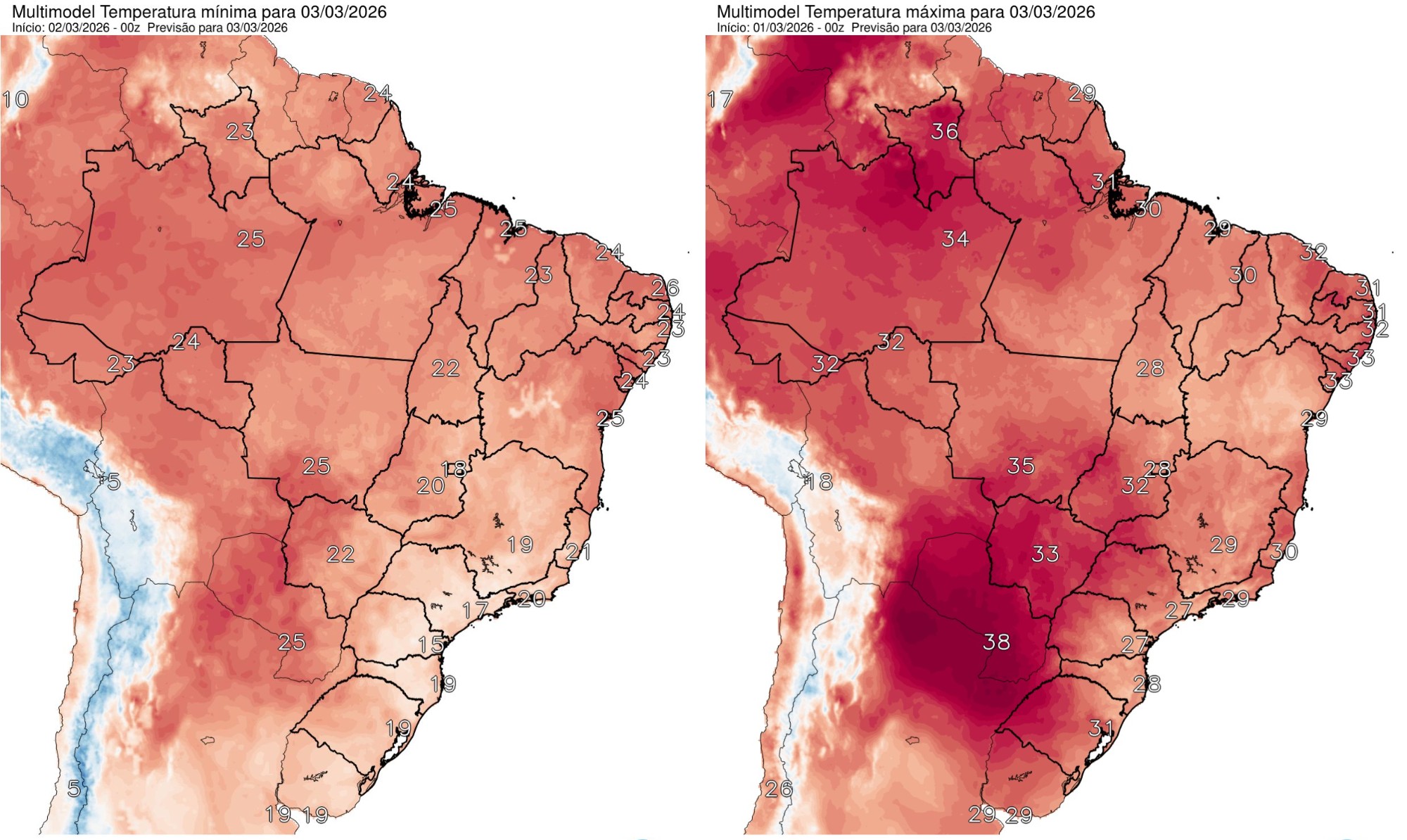 O Instituto Nacional de Meteorologia (Inmet) emitiu alertas de chuva intensa para diversos estados ao norte do Brasil, com grau mais severo no Nordeste. O fenômeno é provocado pela baixa pressão que atua no oceano e serve de suporte para as chuvas. Elas serão moderadas e pontualmente fortes, com rajadas de vento. Emergência em Minas: Governo federal reconhece emergência após barragem em MG entrar em 'risco iminente de rompimento' Leia também: 'Gripe Vampirinha': veja os sinais de alerta com o aumento da infecção 2 semanas do pós-carnaval Nessas regiões o acumulado de chuvas será superior a 100 milímetros por dia, com risco de alagamentos e transbordamento de rios. Em Salvador, os termômetros vão variar de 25°C a 27°C. O dia, na capital, será de céu encoberto e pancadas de chuva com ventos fracos. Previsão de mínima e máxima em todo o país, segundo o INPE, para 02 de março de 2026 Reprodução / INPE — No Norte tem a Zcit, que é a Zona de Convergência Intertropical. Ela proporciona mais chuvas na faixa norte do Maranhão e do Ceará, e a própria influência da Zcas que tá um pouco mais ao sul dessa área mas dá suporte para umidade — explica a meteorologista Andrea Ramos. A Zcas, que é a Zona de Convergência do Atlântico Sul, segundo a meteorologista atua na Bahia, Tocantins, Palmas, Sul do Pará e Piauí. Por essa influência, haverá potencialização da severidade de chuvas na faixa. O triângulo mineiro também pode ser afetado pela condição. Já na porção do centro ao sul do país, a tendência é de diminuição das chuvas. No Rio de Janeiro o dia seguirá de sol com algumas nuvens e chuvas passageiras. Na parte da noite, a previsão é de muitas nuvens mas tempo firme. A mínima poderá chegar aos 18°C e a máxima 31°C. O dia também será de céu limpo em São Paulo, com termômetros variando de 15°C a 28°C. A manhã será de névoa na cidade. Probabilidade de chuva para esta sexta, 02/03/2026 Reprodução / INPE Na Região Sul, a meteorologista explica que há uma linha de instabilidade, um Cavado, atuando na área: — Vamos ter uma mudança na Região Sul, na parte sul do estado do Rio Grande do Sul pode voltar a ter pancadas de chuva de forma isolada, principalmente no sudoeste do estado. Há também possibilidade de nevoeiros na Serra Gaúcha e no litoral de Santa Catarina e Paraná, mas ao longo do dia será dissipada. Em Porto Alegre a mínima será de 19°C e a máxima de 32°C, com nenhuma probabilidade de chuva. A recomendação do Instituto Nacional de Meteorologia (Inmet) é de que a população que mora em locais de alerta severo evite enfrentar o mau tempo, observe a alteração nas encostas e, se possível, desligue aparelhos elétricos e quadro geral de energia. O instituto ainda deixa uma série de instruções para os moradores de áreas que possam ser mais afetadas pelas chuvas. Veja: Desligue aparelhos elétricos, quadro geral de energia; Observe alteração nas encostas; Permaneça em local abrigado, e em caso de rajadas de vento, não se abrigue debaixo de árvores, devido a leve risco de queda e descargas elétricas, e não estacione veículos próximos a torres de transmissão e placas de propaganda; Em caso de situação de inundação, ou similar, proteja seus pertences da água envoltos em sacos plásticos; Obtenha mais informações junto à Defesa Civil (telefone 199) e ao Corpo de Bombeiros (telefone 193).