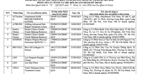 Cục Quản lý Dược quyết định thu hồi 291 số tiếp nhận phiếu công bố, đình chỉ lưu hành và thu hồi toàn quốc các sản phẩm mỹ phẩm chứa chất bị cảnh báo theo Hiệp định ASEAN.