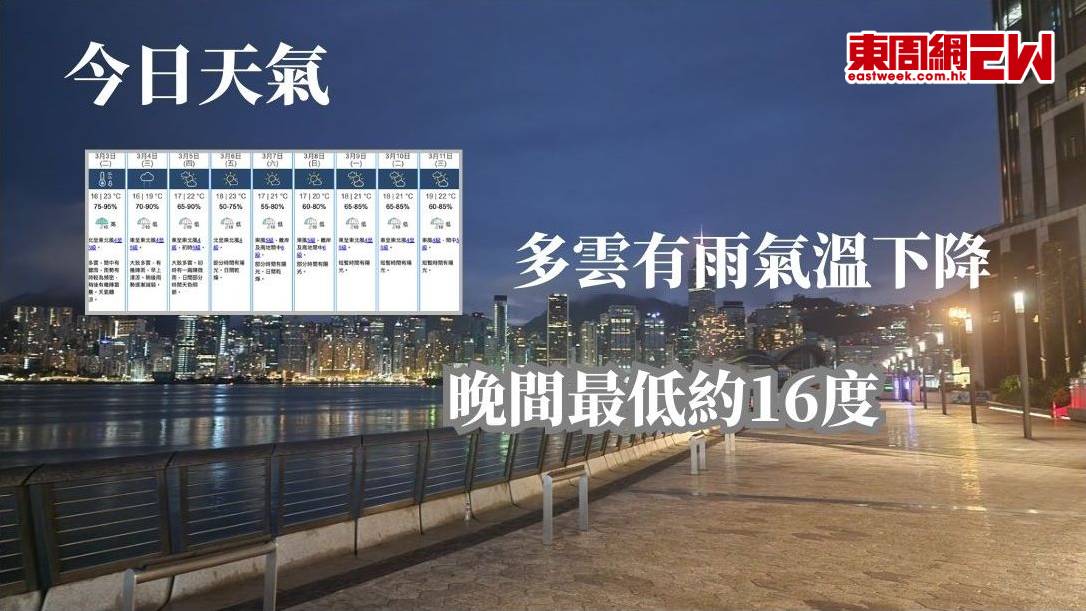 天文台表示,受冷鋒及東北季候風影響,廣東地區天氣轉涼,本港今日亦受驟雨影響,珠江口一帶雨勢時而頻密。 根據預測,本港今日多雲,間中有驟雨,稍後或有雷暴。日間氣溫約在20度徘徊,隨着季候風加強,氣溫將逐步下降,晚間最低約16度。風勢方面,吹和緩至清勁的北至東北風。 展望明日,天氣仍然清涼,雨勢逐漸減弱;至本週後期,隨着較乾燥的季候風補充影響,華南地區天色將逐步好轉,週末天氣有望轉晴。