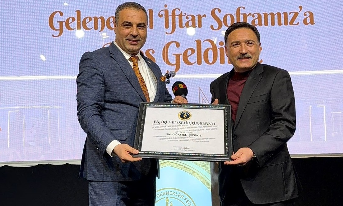 Sivas'ın Akıncılar Belediye Başkanı Murat Sevinç, daha önce ilçede kaymakam olarak görev yapan Kayseri Valisi Gökmen Çiçek'e fahri hemşehrilik beratı takdim etti.