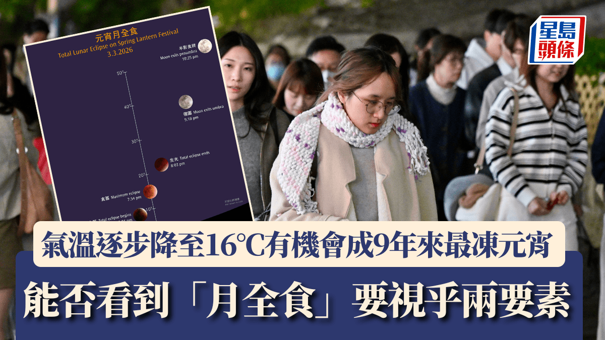 【元宵節天氣】根據天文台自動分區天氣預報,隨著東北季候風殺到,今日(3日)氣溫將逐漸下降,晚上大部分地區氣溫介乎16至17度,打鼓嶺更料低至15度。根據天文台資料,近年最低溫的元宵節出現在2017年2月11日,當日市區氣溫錄得11.5度;其次為2022年2月15日的15.8度。如果今日錄得的氣溫低於15.8度,將會成為近九年來最凍的元宵節。 天氣︱月全食觀賞受天氣影響 此外,今日傍晚香港上空將上演