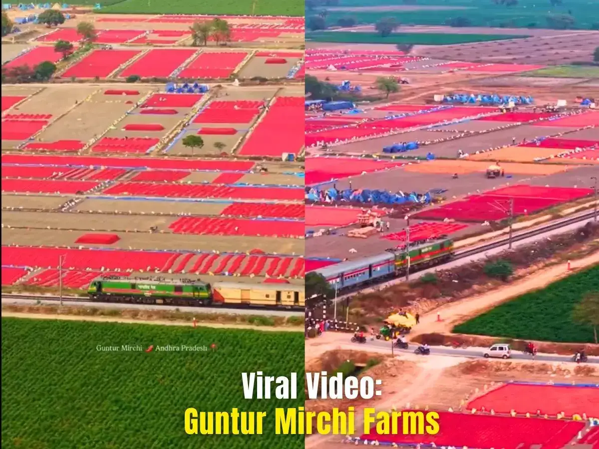 Chilli capital of the world: A high-definition drone video showcasing the sprawling chilli farms of Guntur, Andhra Pradesh, has become a digital sensation, amassing millions of views across social media platforms. The footage captures a bird's-eye view of vast, crimson-colored fields divided by narrow roads where buses and local vehicles navigate through a sea of red.