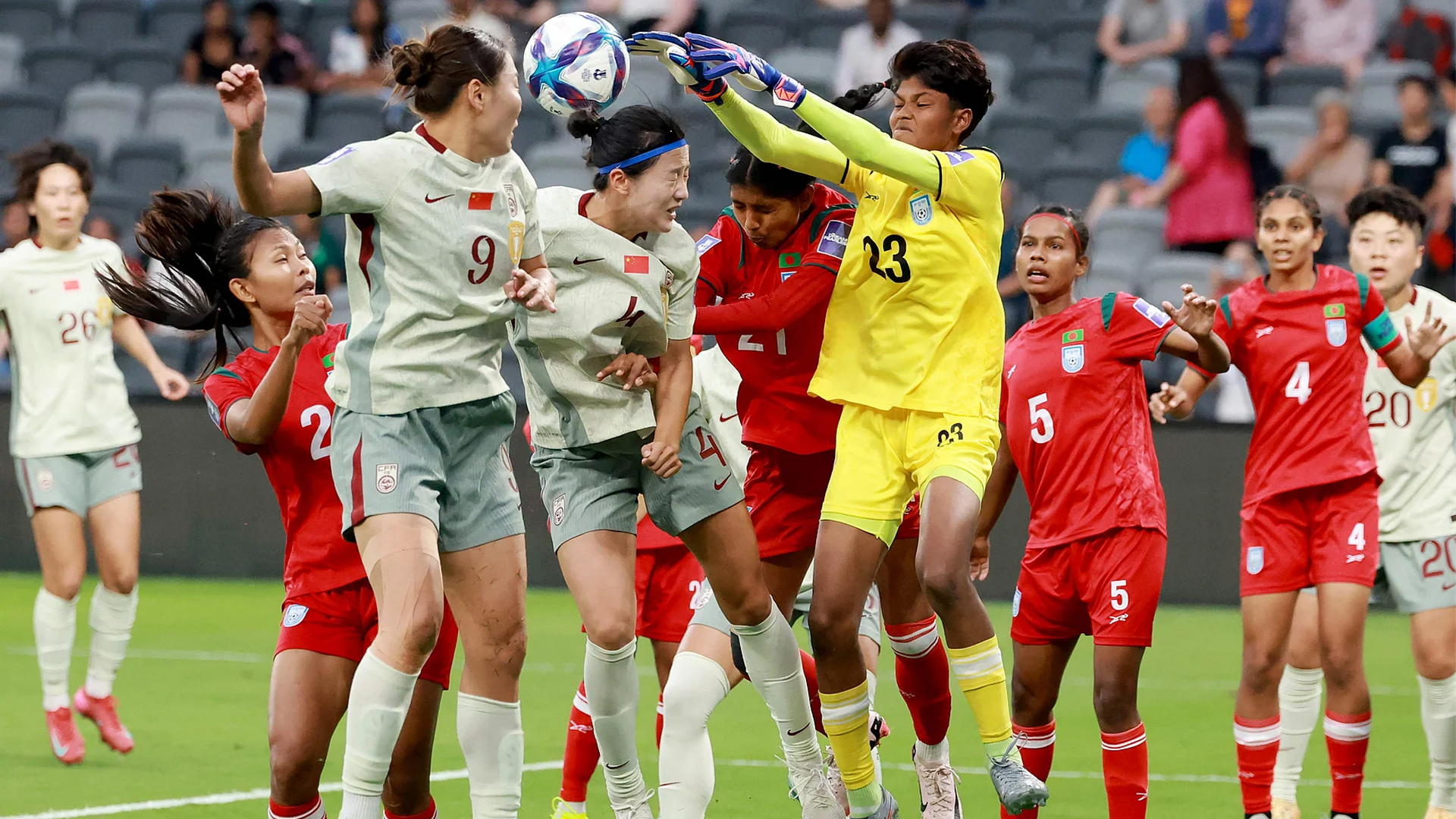 নারী এশিয়ান কাপে নিজেদের প্রথম ম্যাচে শক্তিশালী চীনের বিপক্ষে মাঠে নেমেছে বাংলাদেশ। প্রথমার্ধ শেষে ২-০ গোলে পিছিয়ে আছে বাংলাদেশ নারী দল।প্রথমার্ধের বেশিরভাগ সময়ই রক্ষণাত্মক ফুটবল খেলেছে বাংলাদেশ। তবে প্রথমার্ধ শেষ হওয়ার ঠিক আগে দুইটি গোল হজম করে আফিদার দল। ৩ মিনিটে বাংলাদেশকে দুই গোল দেয় বর্তমান চ্যাম্পিয়নরা।৪৪তম মিনিটে দুরপাল্লার শটে গোল করেন চীনের মিডফিল্ডার ওয়াং সুয়াং। বক্সের বাইরে থেকে বাতাসে ভাসানো শটে দূরের পোস্ট দিয়ে বল জালে জড়ান। তার দুই মিনিট পর বক্সের বাইরে থেকে চীনের মিডফিল্ডার ঝ্যাং রুইয়ের নিচু শট বাংলাদেশের ডিফেন্ডার ওহাতি কিসকুর পায়ে লেগে জালে জড়ায়। শেষ দিকে আরও একটি গোল হতে পারতো চীনের। তবে সহজ সুযোগ নষ্ট করে তারা।আরও পড়ুন: মার্চে সাফ অ-২০ চ্যাম্পিয়নশিপেই বাংলাদেশের জার্সি গায়ে তুলছেন সুলিভান ব্রাদার্স এর আগে ১৪তম মিনিটে ঋতুপর্নার দূরপাল্লার এক শট ঠেকিয়ে দেয় চীনের গোলরক্ষক। আর ম্যাচের ২৪তম মিনিটে চীনের একটি গোল অফসাইডের কারণে বাদ হয়।এদিকে দীর্ঘ ৪৬ বছর পর এশিয়ান কাপে খেলছে বাংলাদেশ। ১৯৮০ সালে সর্বশেষ এশিয়ান কাপে খেলেছে বাংলাদেশ। সেটা ছিল পুরুষদের আসর। নারী এশিয়ান কাপে এবারই প্রথম খেলছে বাংলাদেশ।