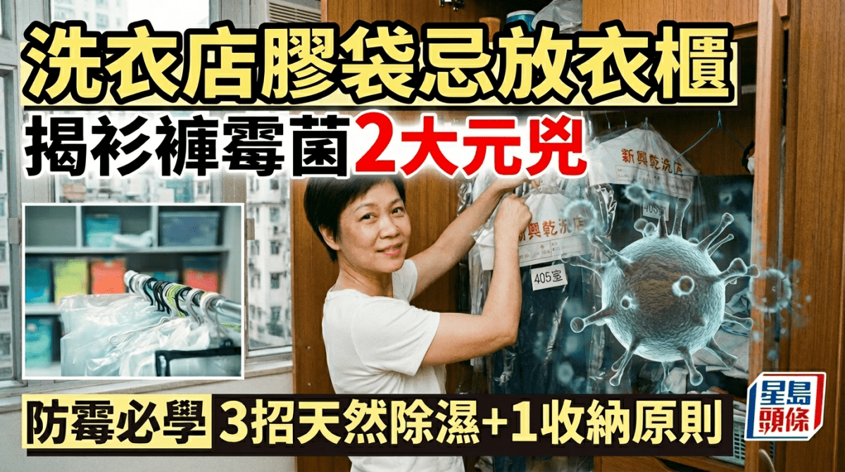 回南天殺到,潮濕天氣不只影響身體,更是衣物發霉的元凶!有專家指,將洗衣店的衣物膠袋一起掛入衣櫃,或會將濕氣一併封存內裡、致霉菌滋生;但原來衣物污漬及食物殘留,同樣是另一個霉菌元兇。 滋生霉菌2大元凶:高濕度、營養物質 衣櫃的霉菌問題,很大原因是由日常習慣造成。日本家事網站分享,衣櫃裡的霉菌通常在高濕度和營養物質共同作用下滋生,霉菌的理想環境: 溫度 在攝氏20至28度的溫度下容易生長 濕度 偏好的