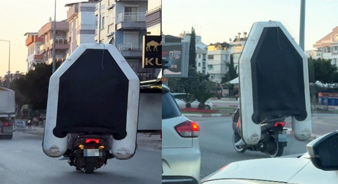 KONYAALTI ilçesinde motosikletle seyir halindeki iki kişinin şişme bot taşıdığı anlar cep telefonu kamerasıyla kaydedildi.