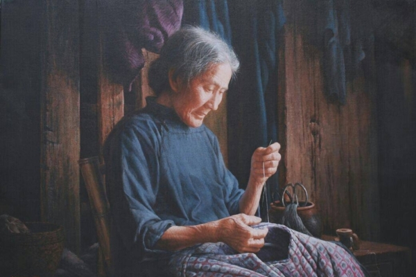 台湾写实油画家魏荣欣作品《补衣的老妇》,画中人物把岁月的凄凉缝在青筋虬结的手上,一针刺进去的是命,一针抽出来的是运,此画作荣获2009年新唐人全世界华人人物写实油画大赛银奖。(魏荣欣提供)