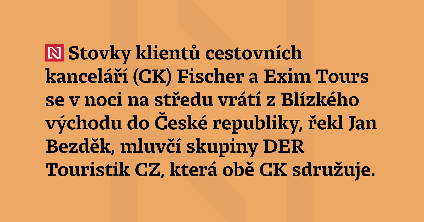 Stovky klientů cestovních kanceláří (CK) Fischer a Exim Tours se v noci na středu vrátí z Blízkého východu do České republiky, řekl mluvčí skupiny DER Touristik CZ, která obě CK sdružuje, Jan Bezděk. V ohroženém regionu je podle systému dobrovolných registrací Drozd, který spravuje české ministerstvo zahraničních věcí, asi 6400 Čechů. „Dnes by to mělo být asi 600 klientů, kteří se […]
