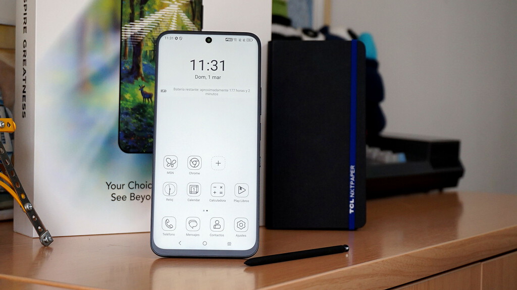 En un mercado móvil saturado de especificaciones clónicas y grandes alardes en cámaras, baterías o procesadores, de vez en cuando nos topamos con un terminal que decide jugar a otra cosa. Eso es exactamente lo que hace el TCL NXTPAPER 60 Ultra . Lejos de intentar ser el más potente de la clase media, este gigante en muchos sentidos ha decidido que lo que más nos importa es nuestra salud visual. Y habida cuenta del tiempo y la diversidad de actividades de consumo de contenidos que hacemos con un smartphone en la actualidad, tiene mucho sentido. Tras pasar unos días con él como smartphone principal, la sensación es clara: este no es un teléfono para todo el mundo. Es un dispositivo tremendamente de nicho , una especie de híbrido entre un smartphone tradicional y un lector de libros electrónicos. Y, sorprendentemente, en ese arriesgado equilibrio, TCL ha conseguido un producto que tiene muchísimo sentido y que resulta de lo más interesante hoy en día. Ficha técnica del TCL NXTPAPER 60 Ultra TCL NXTPAPER 60 Ultra pantalla 7,2 pulgadas FHD+ (1080 x 2340), 263 ppp 120Hz 850 nits Cristal Nano-matrix Recubrimiento anti-huellas procesador MediaTek Dimensity 7400 GPU Mali-G615 memoria ram 12GB almacenamiento 256/512GB software Android 15 dimensiones y peso 174.45 x 81.23 x 7.57 mm 227g cámaras traseras Principal: 50MP (1/1,55", 1.0um), OIS, f/1.8 Teleobjetivo: 50MP (1/2.8", 0.64um), OIS, f/2.4, zoom 3x Angular: 8MP (1/4", 1.12um), f/2.2 cámara frontal 32MP (1/3.1", 0.7um), f/2.0 batería 5.200 mAh Carga rápida 33W USB-C 2.0 conectividad NFC, Bluetooth 5.4, USB-C 2.0 otros Resistencia IP68 Desbloqueo facial y sensor de huellas lateral precio 256GB: 499 euros 512GB: 549 euros Diseño: un "gigante" sorprendentemente cómodo Al sacar el TCL NXTPAPER 60 Ultra de la caja, el primer impacto es inevitable: es un teléfono enorme. Estamos hablando de 7,2 pulgadas, un territorio donde la frontera con las tablets pequeñas se desdibuja. Hace años incluso hablaríamos de phablet, concepto ya extinguido. Por suerte. Sin embargo, cuando sostienes este nuevo terminal de TCL, la percepción cambia completamente. Con sus 227 gramos y un grosor de apenas 7,57 mm, se siente sorprendentemente ligero para su envergadura. Y cada décima de pulgada ganada merece la pena. Con sus más de 7 pulgadas y 225 gramos de peso, el TCL NXTPAPER 60 Ultra asusta. Pero sin embargo es un teléfono cómodo, manejable y donde cada pulgada de más se agradece TCL ha optado por un diseño dominado por el plástico en su chasis , algo lógico para mantener a raya el peso, con un tacto muy sólido y un imponente módulo de cámaras circular en la trasera que inevitablemente atrapará las miradas. Y pese a que sobresale bastante, es tan grande en superficie que no permite que, colocado sobre una superficie plana, nos de problemas para manejarlo y se balancee. El botón-deslizador es el más importante en este TCL Pese al acabado en plástico de la parte trasera, el marco metálico le otorga un nivel de acabado premium que no le hace desmerecedor de la etiqueta de gama media de nivel. Los controles físicos de ese marco presentan un acabado del mismo nivel. Hay además botón de encendido que integra lector de huellas . Su colocación es justa para alcanzarla cuando agarramos el terminal con una sola mano, máxime cuando se da el caso de que si lo agarramos algo más arriba para poder identificarnos por huella dactilar, la presencia del módulo de cámara ya nos resulta algo molesta. Hay una funda de tipo libro que viene incluida. Curioso cuanto menos En mi caso he optado por combinar la identificación de huellas usando el dedo de la mano que no agarra el terminal y la identificación por rostros con un resultado perfecto. Un detalle que se agradece inmensamente en este rango de precios es la inclusión de la certificación IP68 contra polvo y agua , y que en la caja se incluye una funda junto a un compartimento acoplable para el stylus (T-Pen). Eso sí, ten en cuenta que ponerle la funda lo convierte definitivamente en un inquilino exigente para el bolsillo de tu pantalón. En Xataka Los mejores móviles (2026), los hemos probado y aquí están sus análisis Pantalla: la protagonista absoluta (y el motivo de compra más claro) El verdadero hallazgo y punto destacado del TCL NXTPAPER 60 Ultra sin duda alguna es la pantalla. Y no solo por su tamaño. Aquí la clave está en la tecnología NXTPAPER 4.0 que incluye su panel. La gran pantalla del TCL NXTPAPER 60 Ultra ofrece una experiencia diferente a quien busque consumir mucho contenido que no sea multimedia con el equipo. A cambio reduce la resolución y brillo en comparación con sus rivales directos A primera vista cualquiera que observe con cierto detenimiento la pantalla del TCL 60 Ultra te indicará algo obvio: ¿es la pantalla de tipo mate? A mi me lo preguntaron con mucha curiosidad y mi sonrisa y afirmación dieron a entender que sí, que lo es y además lo considero todo un acierto. A simple vista podría pasar perfectamente por pantalla de tinta electrónica. La textura es idéntica a la vista y al tacto Empezamos primero repasando las características técnicas del panel, aunque lo interesante no son los números. Tenemos una pantalla de 7,2 pulgadas , de tipo LCD, con frecuencia de refresco de 120 Hz y resolución FHD+ (1080 x 2340 píxeles). Este último dato junto con el brillo que no supera los 850 nits son cifras que nos dejarían bastante fríos si el análisis de la pantalla acabara aquí. Pero no es así en absoluto. La pantalla se aleja mucho en bastantes aspectos a una tradicional. No solo por el acabado mate que facilita su lectura sino también por el tacto. Aquí no hay un cristal frío y resbaladizo, sino una superficie ligeramente aterciopelada, como si tocaras papel de alta calidad. Este recubrimiento elimina de manera bastante eficiente los reflejos y consigue transmitirnos la sensación de estar escribiendo en papel físico cuando usamos el s