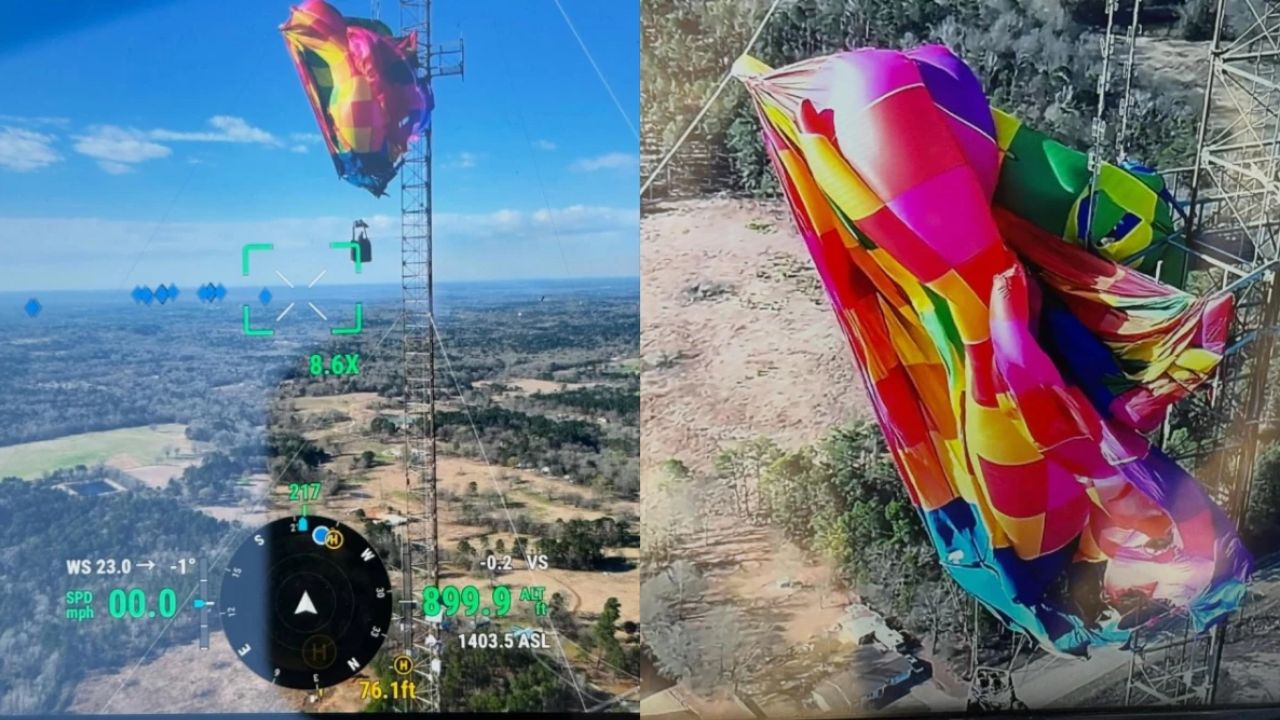 El rescate de globo aerostático en Texas movilizó a equipos especializados luego de que dos personas quedaran suspendidas tras chocar contra una torre.