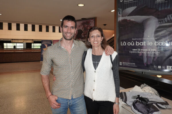 2026年3月3日下午,庄园农业旅游负责人Tatiana Guillemin(右)与David Rouquette观看了神韵世界艺术团在法国蒙彼利埃的第三场演出。(亦凡/大纪元)