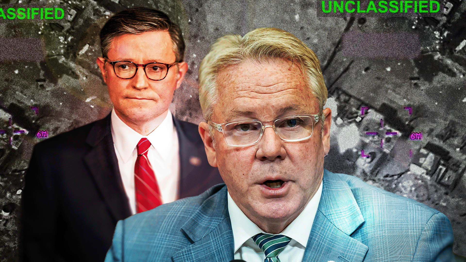 Mike Johnson and Warren Davidson with aerial war footage in the background