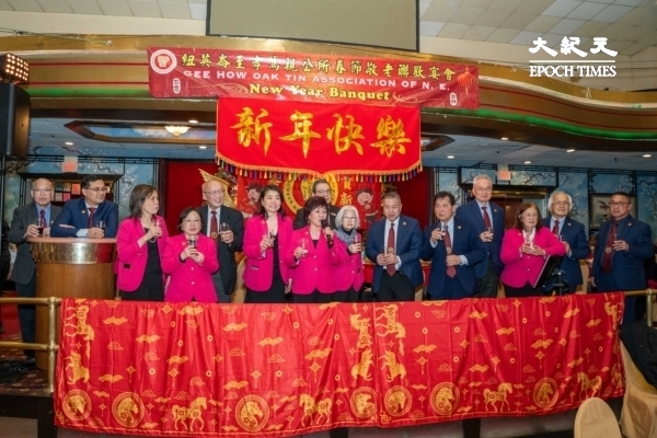 纽英崙至孝笃亲公所2月28日举办马年春宴,职员及元老向来宾们敬酒。(刘景烨/大纪元)