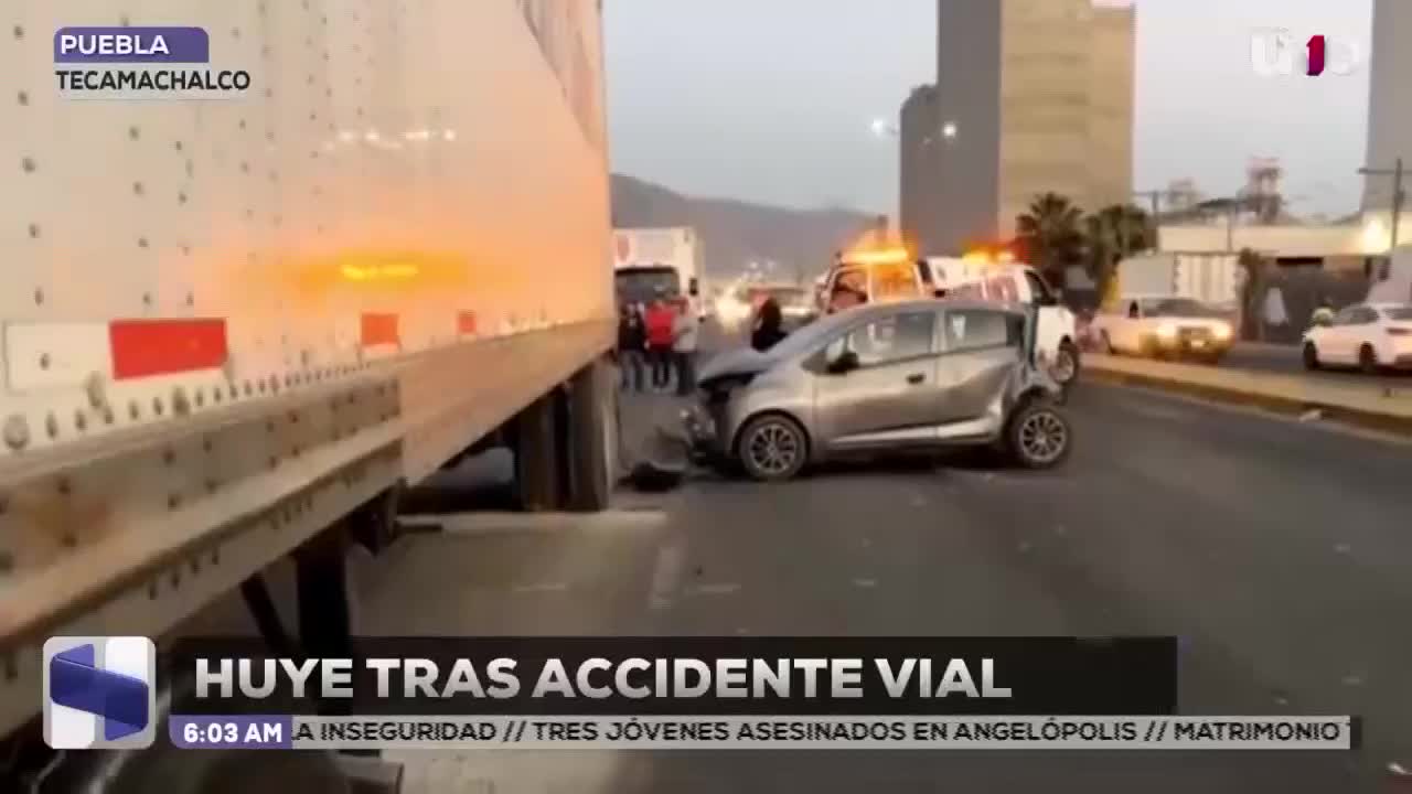 Un hombre resultó lesionado tras un accidente sobre la carretera federal Puebla–Tehuacán, luego de que un vehículo no respetara un tope y provocara un impacto que terminó contra un tractocamión estacionado; el presunto responsable huyó del lugar.