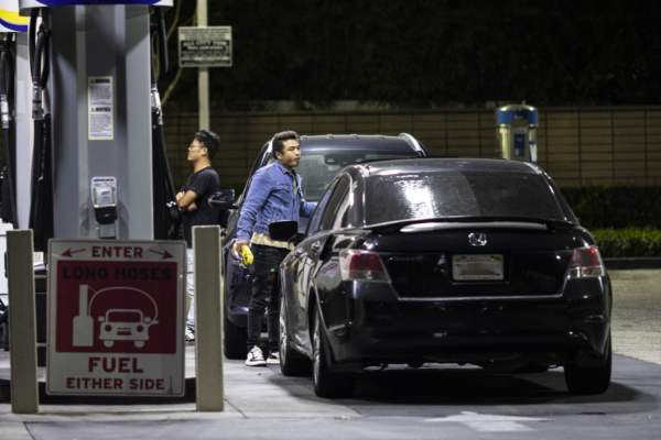 2025年3月25日,顾客在洛杉矶一处加油站加油。(John Fredricks/The Epoch Times)