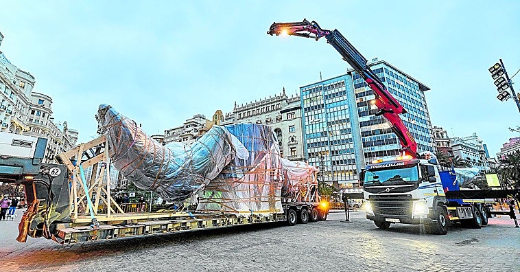 La falla municipal ya se deja ver en la plaza del Ayuntamiento y los artistas de Convento y Almirante cambian el transporte de piezas al viernes