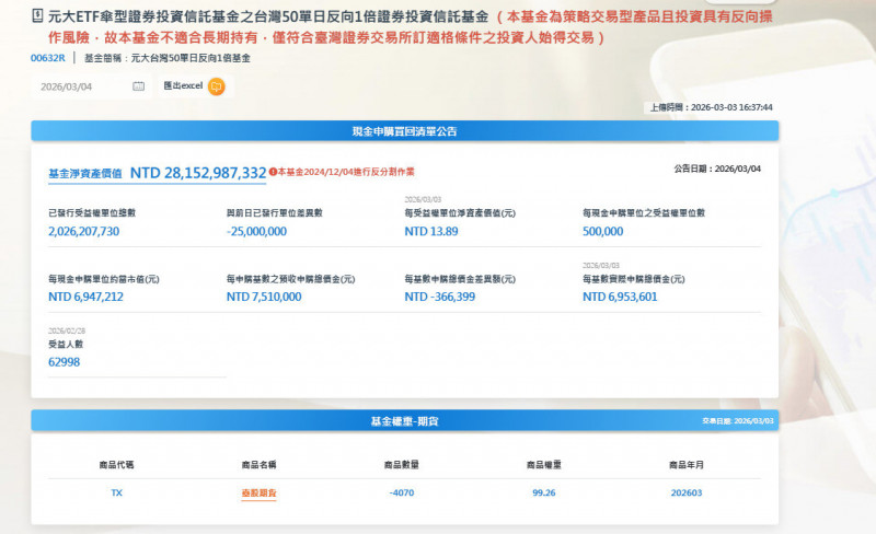 受到美股四大指數下跌、中東戰事時程恐拉長影響,國際股市皆墨,台股今日開盤跳空下跌,一度大跌逾1300點,避險資金湧入元大台灣50反1ETF(00632R),截至9:41分...…
