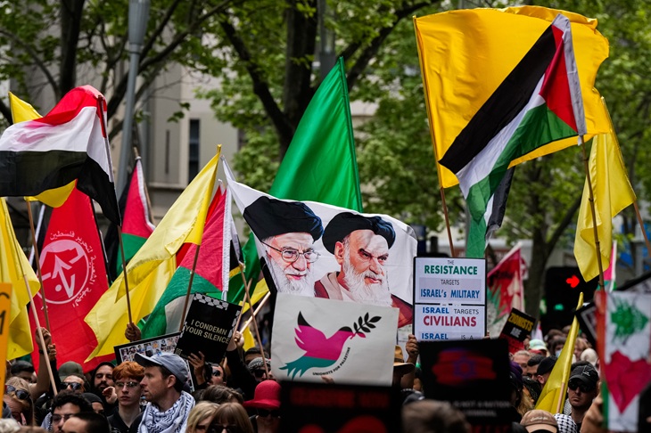 MELBOURNE, AUSTRALIA - OCTOBER 06: A flag bearing the face of Iran's Supreme Leader, Ayatollah Ali Khamenei is waved on October 06, 2024 in Melbourne, Australia. Organizers of pro-Palestine protests in Sydney are set to proceed with a rally on Sunday, October 6, despite legal attempts by police to prohibit the gatherings due to safety concerns related to anticipated crowd sizes and potential disruptions. The following day, a vigil is scheduled to honor victims of violence in Gaza, coinciding with the one-year anniversary of the Hamas attacks, which has drawn criticism from government officials who deem the timing "extremely provocative". Protesters also planned to gather for similar events in Melbourne. (Photo by Asanka Ratnayake/Getty Images)