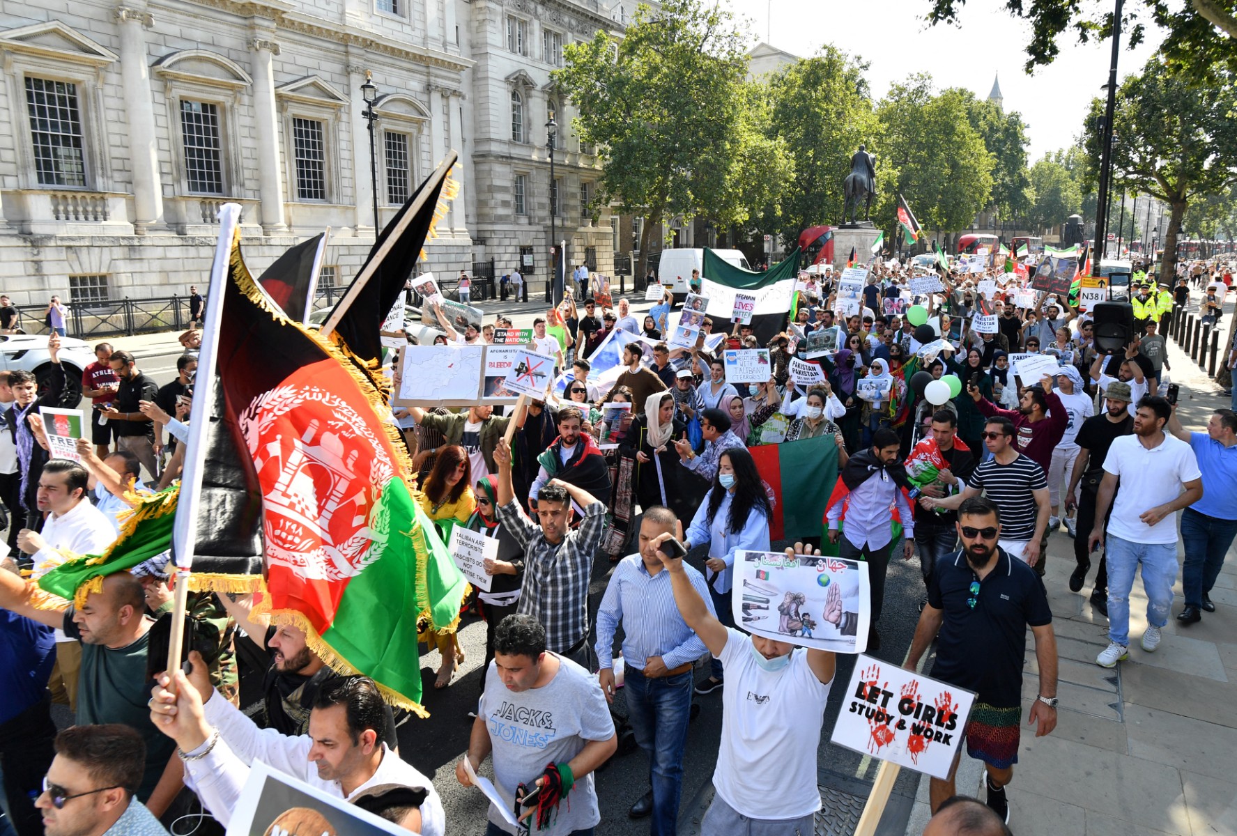 افغان کمیونٹی کے ارکان 7 ستمبر 2021 کو وسطی لندن میں مظاہرہ کر رہے ہیں (جسٹن ٹیلس/ اے ایف پی)