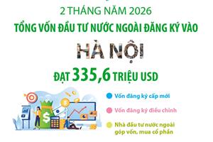 2 tháng năm 2026, vốn đầu tư nước ngoài vào Hà Nội đạt 335,6 triệu USD. Trong đó, đăng ký cấp mới 100 dự án với số vốn đạt 37,3 triệu USD; 26 dự án bổ sung tăng vốn đầu tư với 248,3 triệu USD; 64 lượt nhà đầu tư nước ngoài góp vốn, mua cổ phần đạt 50,0 triệu USD.