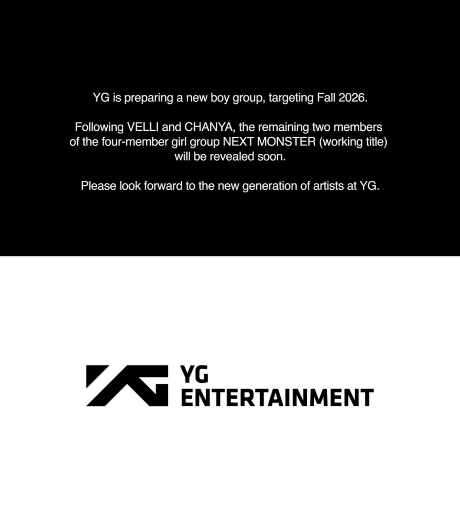 YG엔터테인먼트가 6년만에 새 남자 그룹을 론칭한다. YG엔터테인먼트는 4일 공식 블로그에 ‘2026 YG PLAN | YG ANNOUNCEMENT’를 게재했다. 올해 예정된 소속 아티스트 활동 플랜을 담은 양현석 총괄 프로듀서의 인터뷰와 더불어 현재 준비 중인 신인 그룹들에 대한 로드맵을 공개한 것.먼저 YG 측은 자막을 통해 “2026년 가을을 목표로 새로운 보이 그룹을 준비하고 있다”고 전했다. 지난해 양현석 총괄은 데뷔를 염두에 둔 남자 연습생 팀이 있음을 밝히며 “계속 이 친구들을 탐구하고 분석하고 있다. 내년에는 한 팀을 꼭 론칭하고 싶다”는 의지를 전한 바 있다. 이로써 YG는 트레저 이후 6년 만에 새로운 보이 그룹을 선보인다. 4인조 신인 걸그룹 넥스트 몬스터(가칭)의 윤곽도 보다 뚜렷해졌다. 지난해 퍼포먼스와 가창 영상을 통해 이미 완성형 실력을 보여줬던 이벨리와 찬야에 이어 다른 두 멤버를 공개할 것을 예고했다.YG는 이번 영상에서 빅뱅의 데뷔 20주