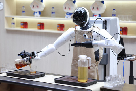Sejumlah robot menyajikan makanan dan minuman kepada pengunjung di stan China Mobile di ajang Mobile World Congress 2026 di Barcelona, Spanyol. #kumparanTECH #newsupdate