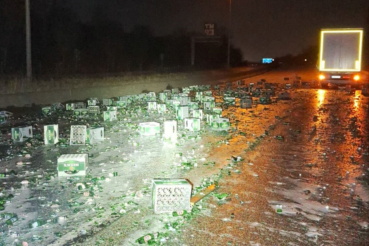 Ein Lastwagen hat in der Nacht zu Mittwoch in Bremen ein Teil seiner Ladung verloren. Zahlreiche Bierkästen lagen auf der Auffahrt zur A281.
