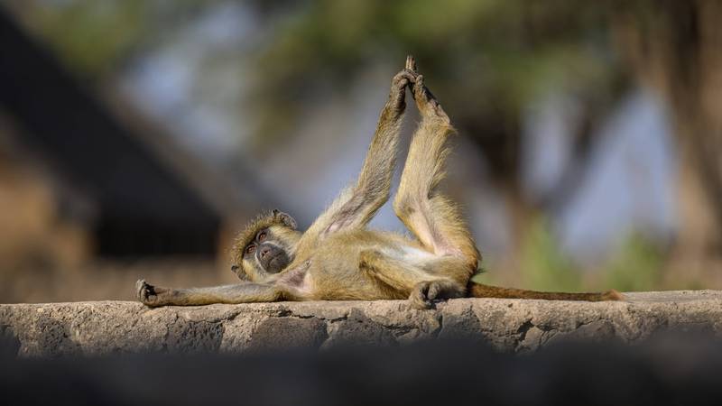 Na jednoj fotografiji, pavijan leži na leđima s jednom nogom visoko podignutom iznad glave, dok na drugoj spaja stopala kao da je usred vježbe fleksibilnosti...