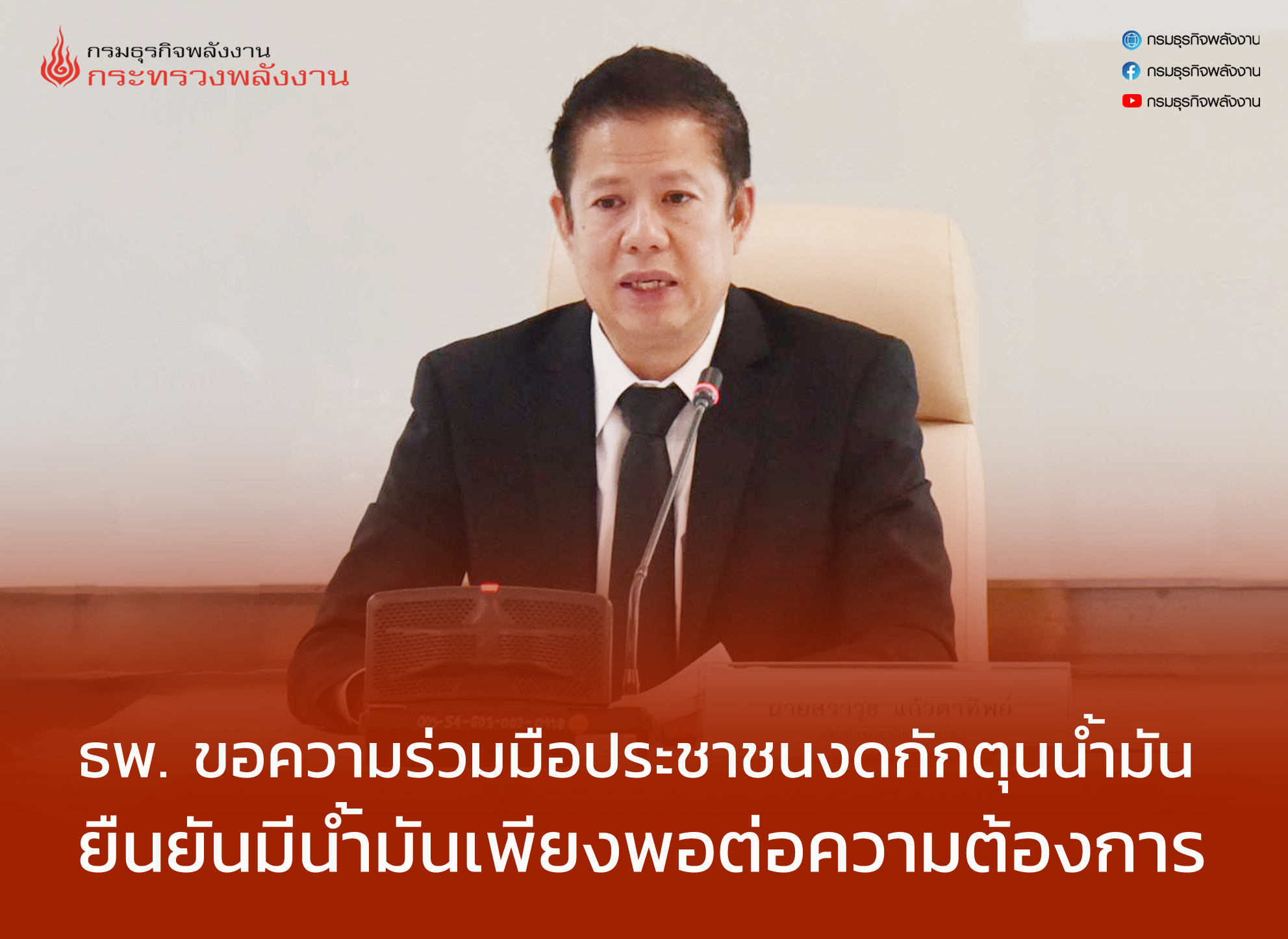 กรมธุรกิจพลังงาน ขอความร่วมมือประชาชนงดกักตุนน้ำมัน ยืน […] อ่านข่าวต้นฉบับ: ก.พลังงาน ขอความร่วมมือประชาชน งดกักตุนน้ำมัน ยืนยันมีน้ำมันเพียงพอ