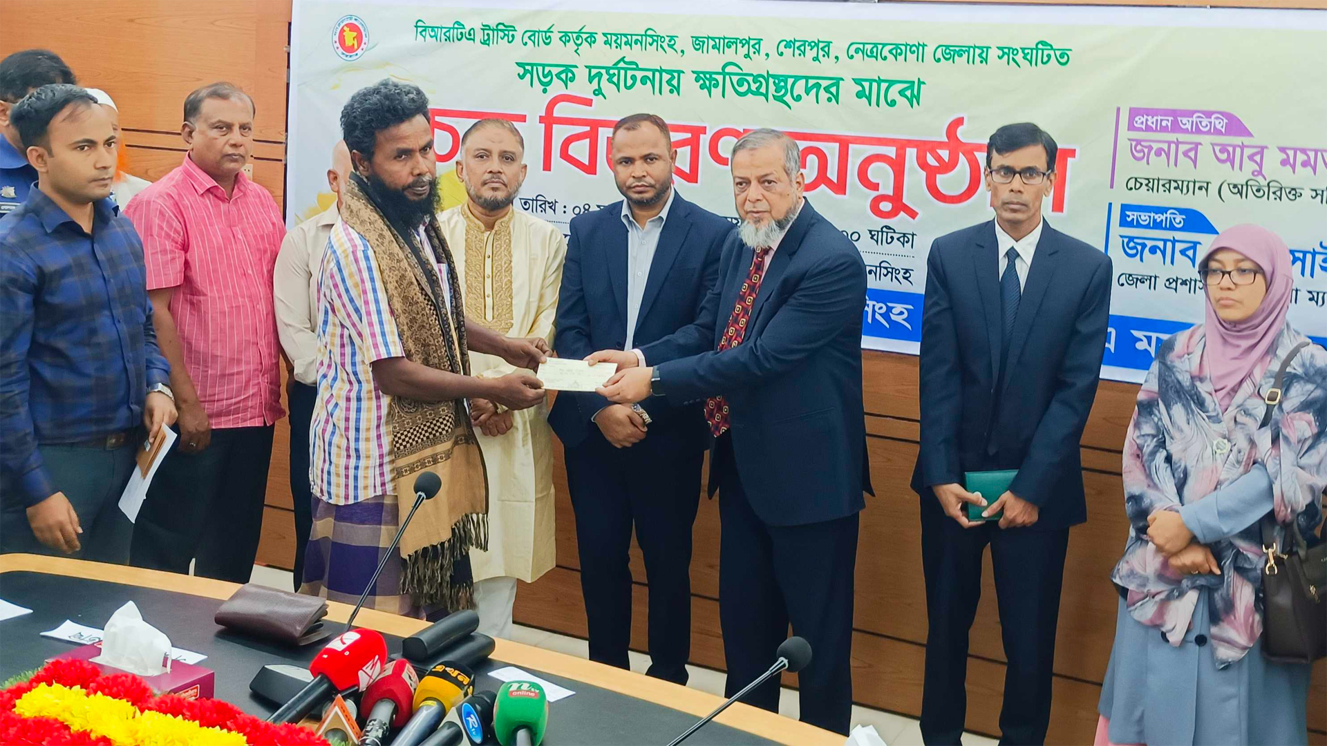 ময়মনসিংহে সড়ক দুর্ঘটনায় আহত ব্যক্তি এবং নিহতদের পরিবারের মাঝে ৫ কোটি ২৯ লাখ টাকার আর্থিক সহায়তার চেক বিতরণ করেছে বাংলাদেশ সড়ক পরিবহন কর্তৃপক্ষ- বিআরটিএ ট্রাস্টি বোর্ড।বুধবার সকালে ময়মনসিংহ সিটি করপোরেশন মিলনায়তনে ময়মনসিংহ বিভাগের চার জেলার মোট ১৩৩ জন ক্ষতিগ্রস্ত পরিবারের স্বজনদের হাতে এ চেক তুলে দেন বিআরটিএ'র চেয়ারম্যান আবু মমতাজ সাদ উদ্দিন আহমেদ।আবেদনকারী ক্ষতিগ্রস্তদের মধ্যে আহতদের প্রত্যেককে ১ থেকে ৩ লাখ টাকা এবং নিহতদের স্বজনদের ৫ লাখ টাকা করে ক্ষতিপূরণ দেওয়া হয়। জেলা প্রশাসন ও বিএআরটিএ ময়মনসিংহ বিভাগের আয়োজনে এ অনুষ্ঠানে ময়মনসিংহ জেলায় ৭৬ টি চেকের বিপরীতে ৩ কোটি ৪ লাখ টাকা, জামালপুর জেলায় ৩৫ জনকে ১ কোটি ২৭ লাখ, নেত্রকোনায় ১৮ জনকে ৭৮ লাখ ও শেরপুরে ৪ জনকে ২০ লাখ টাকার সহায়তা দেয়া হয়।সড়ক দুর্ঘটনায় ক্ষতিগ্রস্ত পরিবারগুলোর পাশে দাঁড়ানো সরকারের দায়িত্ব উল্লেখ করে বিআরটিএ চেয়ারম্যান আবু মমতাজ সাদ উদ্দিন আহমেদ বলেন, দুর্ঘটনা প্রতিরোধে সচেতনতা বাড়ানোর পাশাপাশি আইন প্রয়োগ আরও জোরদার করতে হবে। একই সঙ্গে ভুক্তভোগী পরিবারগুলোকে দ্রুততম সময়ে আর্থিক সহায়তা পৌঁছে দিতে বিআরটিএ ট্রাস্টি বোর্ড কাজ করে যাচ্ছে বলেও জানান তিনি।আরও পড়ুন: মমেক হাসপাতাল পরিদর্শনে এমপি ওয়াহাব, কাঙ্ক্ষিত স্বাস্থ্যসেবা নিশ্চিতের তাগিদময়মনসিংহের জেলা প্রশাসক মো. সাইফুর রহমানের সভাপতিত্বে অনুষ্ঠানে বিআরটিএ'র পরিচালক (অডিট ও আইন) রুবাইয়াৎ-ই-আশিক, ময়মনসিংহ বিভাগীয় কার্যালয়ের উপপরিচালক (ইঞ্জি.) সুব্রত কুমার দেবনাথ, অতিরিক্ত জেলা ম্যাজিস্ট্রেট মো. আসাদুজ্জামান, বিআরটিএ’র নির্বাহী ম্যাজিস্ট্রেট ইফফাত হাশেম, জিলা মটরযান মালিক সমিতির সভাপতি আলমগীর মাহমুদসহ বিআরটিএ'র কর্মকর্তা, মটর মালিক ও শ্রমিক সংগঠনের নেতারা উপস্থিত ছিলেন।