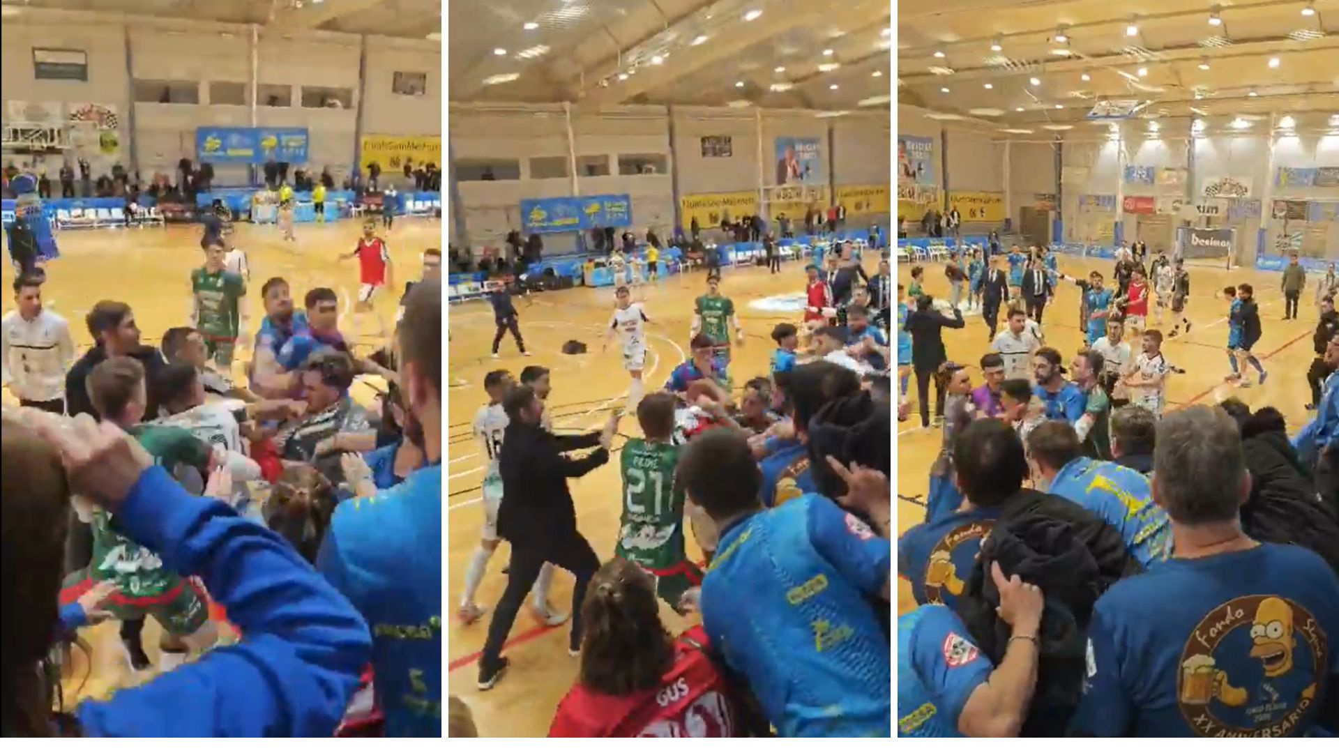 El Noia Portus Apostoli goleó este martes al Servigroup Peñíscola 1-6 en un encuentro pendiente de la 18ª jornada y se mete de lleno en la lucha por disputar las eliminatorias por el título de la Primera División de fútbol sala. El choque había sido aplazado semanas atrás por la meteorología adversa en el territorio levantino. Con estos tres puntos, el Noia se sitúa a solo dos unidades de la octava posición, actualmente en manos del Jaén Paraíso Interior con 29 puntos, y se mete de lleno en la pelea por el octavo puesto. Precisamente, este sábado jugará ante los andaluces en el Olivo Arena. El Servigroup Peñíscola, por su parte, continúa en una zona tranquila de la tabla, con un colchón de once puntos sobre el descenso. Sin embargo, lo visto sobre la pista quedó empañado por una gravísima pelea final, la más fuerte en años en Primera División, en la que jugadores de uno y otro equipo se intercambiaron patadas y puñetazos. La Guardia Civil tuvo incluso que intervenir para poner paz y separar a miembros de Noia y Peñiscola. Se esperan duras sanciones porque en las imágenes pueden verse fuertes agresiones y golpes, incluso, por la espalda, y gente lanzándose desde la grada para unirse a la trifulca. Una vez finalizado el partido y cuando los jugadores de ambos equipos se están saludando protocolariamente, suceden una serie de hechos que procedemos a relatar a continuación: -Los jugadores dorsal 20 del equipo local (Sancho Bonet, Diego) y dorsal 10 del equipo visitante (Macedo Rodrigues, Tiago Manuel) se empujan mutuamente. A ellos se une el jugador dorsal 9 del equipo local (Sánchez Colchón, Juan Carlos). Entre los citados jugadores del equipo local lanzan un puñetazo que impacta en el jugador visitante sin poder identificar el ejecutor. -A continuación, el jugador dorsal 10 del equipo visitante responde lanzando una patada impactando en el jugador dorsal 20 del equipo local. -Tras ello, el jugador dorsal 10 del equipo visitante se mueve hacia otra zona del terreno de juego a donde llega corriendo el jugador dorsal 12 del equipo local (González Vázquez, Giovanni Miguel) que salta hacia él lanzándole una patada y contactando con sus manos en el cuerpo del citado jugador rival. -En ese momento, una persona de la grada salta al terreno juego y se aproxima al jugador dorsal 10 del equipo visitante lanzándole dos puñetazos, impactando en su cuerpo el primero de ellos. -Tras ello, el jugador dorsal 10 del equipo visitante se mueve hacia un lugar cercano a la grada de animación. En ese momento se aproxima a él el jugador dorsal 10 del equipo local (Moreno López, Juan José) quien le propina varios puñetazos a los que responde el citado dorsal 10 visitante golpeándole en su cara. -Tras este hecho, se aproxima el jugador dorsal 9 del equipo local que lanza dos puñetazos que impactan (al menos uno de ellos) en dos jugadores visitantes sin identificar. -Junto a este tumulto, otra persona que salta desde la grada lanza una patada hacia un integrante del equipo visitante sin poder identificar a quien golpea. -En el terreno de juego se muestra tarjeta roja al jugador dorsal 9 de equipo local (Sánchez Colchón, Juan Carlos) y al jugador 10 del equipo visitante (Macedo Rodrigues, Tiago Manuel) ambos por los motivos anteriormente descritos. Debido al tumulto sucedido y la cantidad de personas implicadas, no podemos afirmar otro tipo de acciones ocurridas. Informamos que en el terreno de juego había muchas personas sin identificar debido a la actuación de seguridad privada del club, guardia civil y Policía, además de directivos de ambos equipos