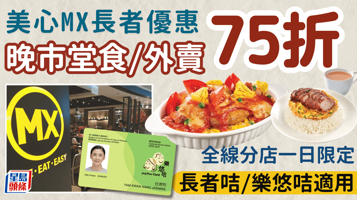 美心MX長者優惠|連鎖快餐店美心MX提供多種美食選擇,從香氣四溢的招牌燒味,到鑊氣十足的中式小菜,總能滿足不同顧客的口味。最近,美心MX及美心Food²特別為長者朋友推出極具吸引力的晚市優惠,在指定日子提供堂食及外賣75折,讓老友記們能以更實惠的價錢,輕鬆享受一頓豐富晚餐。 美心MX長者一日限定 堂食+外賣75折優惠 美心MX長者咭/樂悠咭75折優惠 持長者咭或樂悠咭的老友記,只要於明日(3月5日
