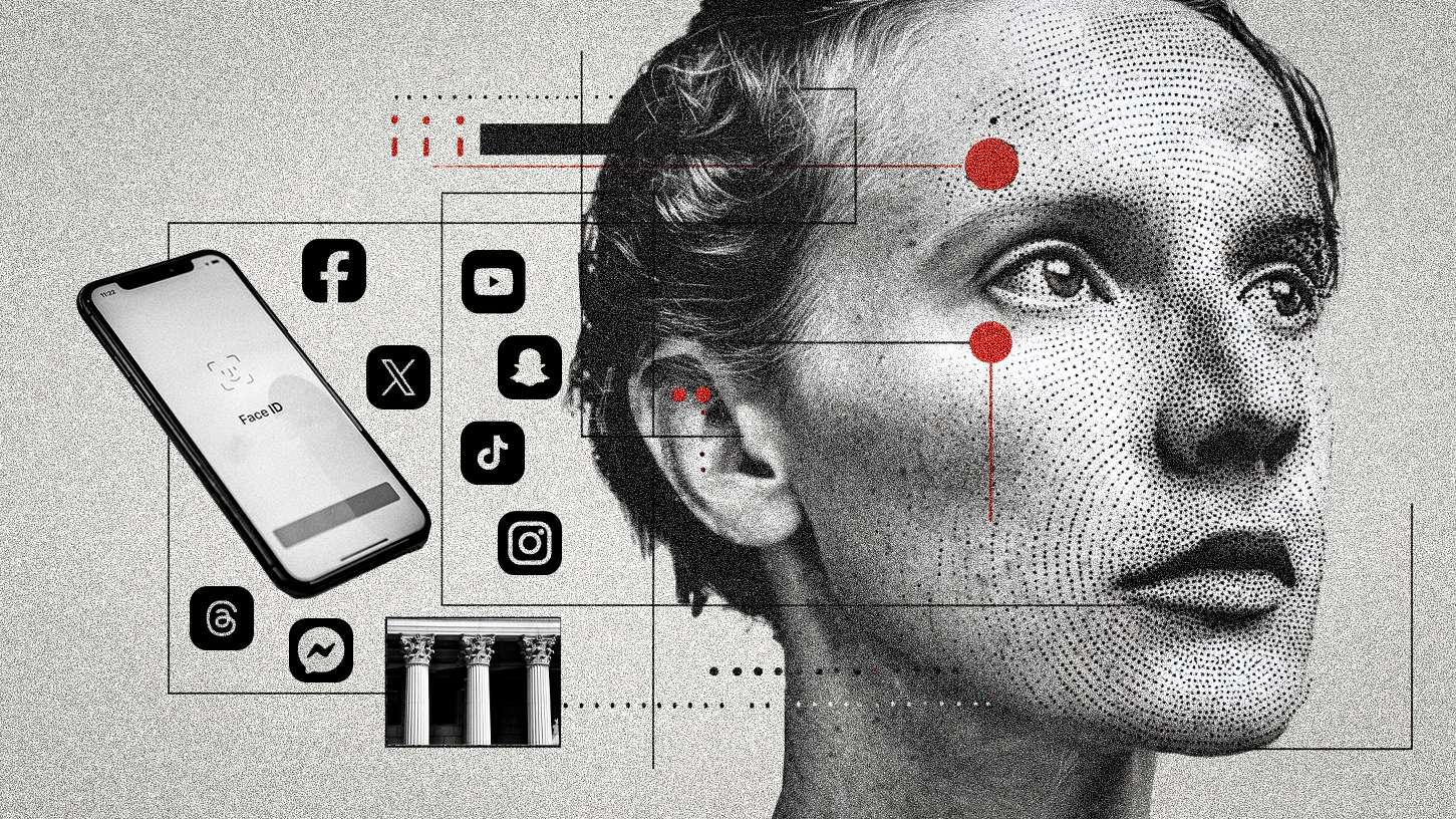Biometric markers on a woman's face, tied to social media platforms