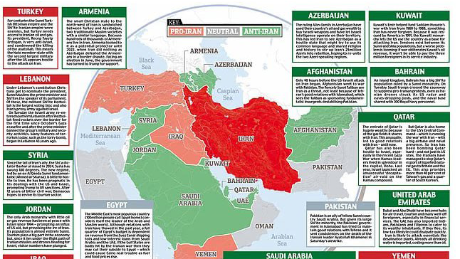 טורקיה הוגדרה פרו-איראנית - לפני היירוט הדרמטי של טיל בדרך לשטחה. מצרים, "מנהיגת העולם הערבי", נחשבת לנייטרלית. אזרבייג'ן רוכשת נשק ישראלי, גם יריבתה ארמניה נכללת במדינות האנטי-איראניות. ב"דיילי מייל" הבריטי מיפו את מדינות המזרח התיכון עבור הקוראים שמתקשים להבין מי נגד מי במלחמה