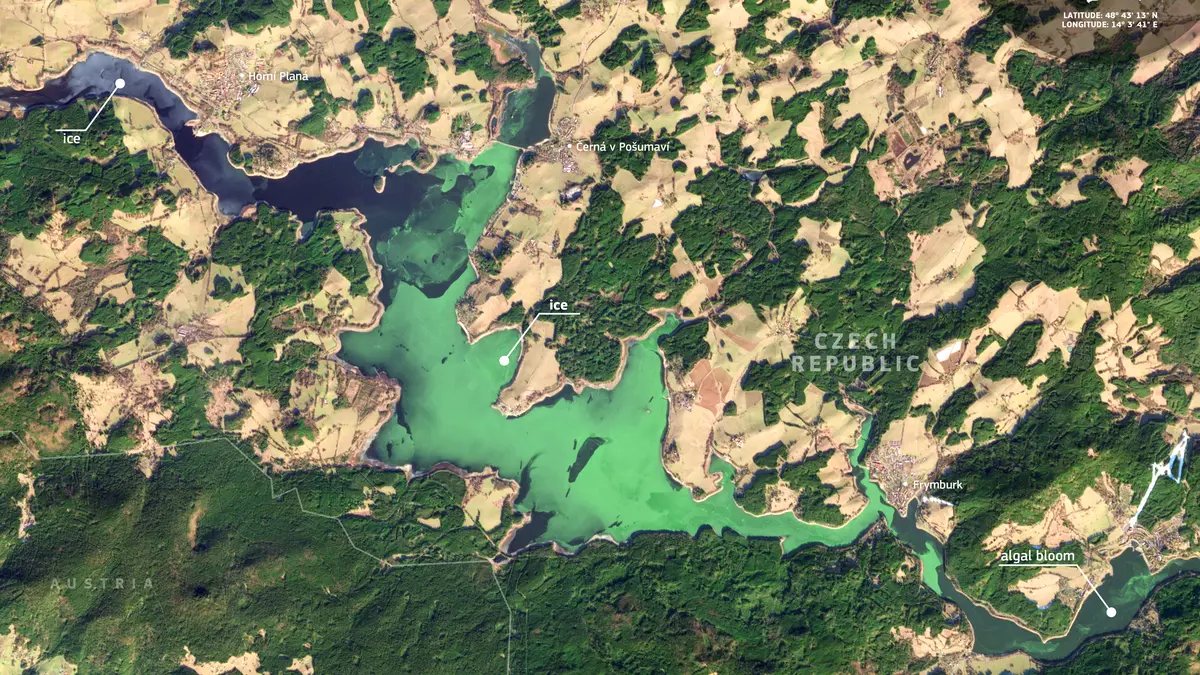 Vědci dál zkoumají jedinečný úkaz, zelený led na lipenské vodní nádrži. Začali bádat na konci minulého roku a nyní uvedli, že satelitní analýza kvality vody ukázala mimořádné množství sinic. Koncentrace byla stejná jako v létě, když kvete voda na rybníku.