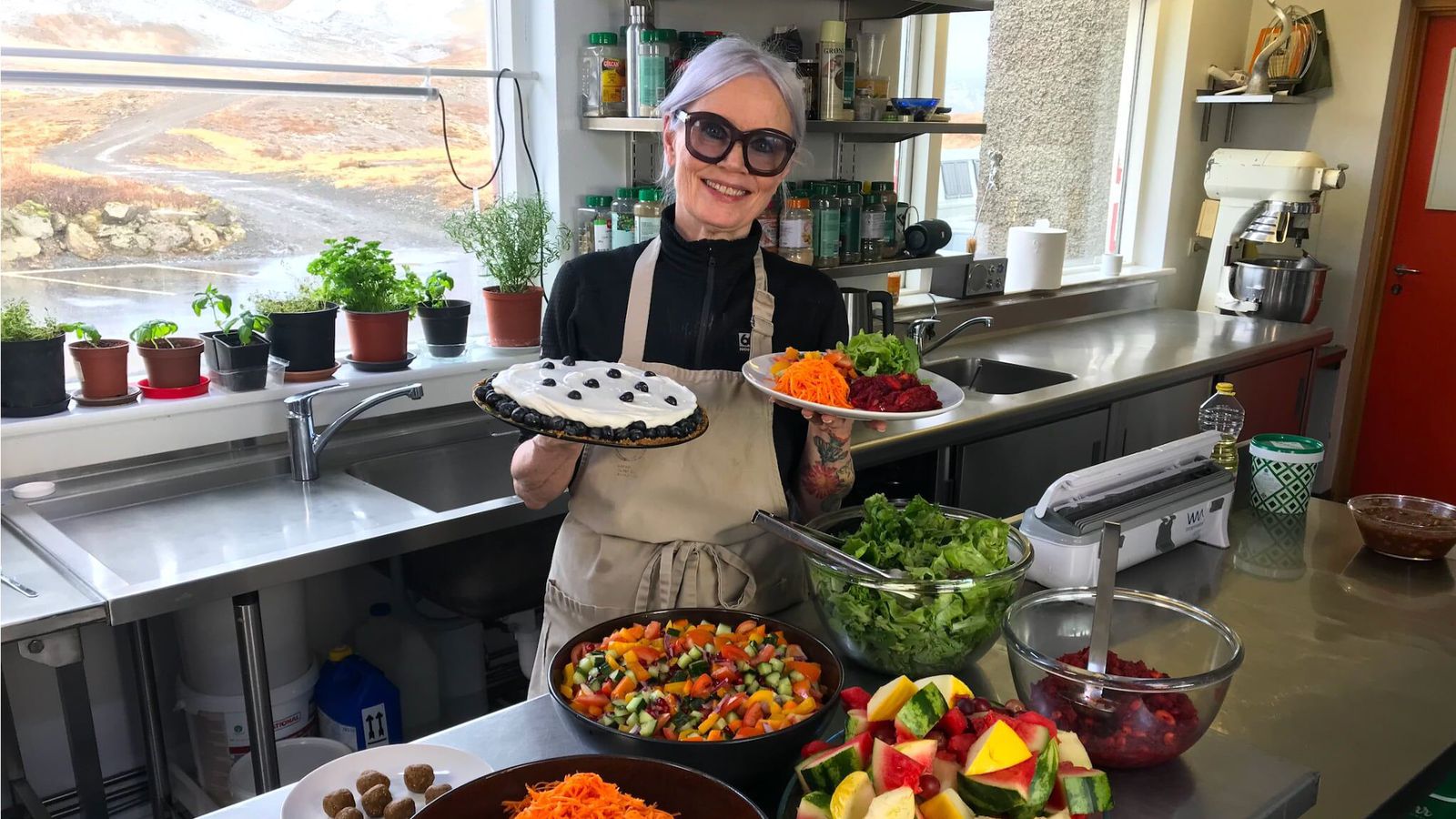 Hin margverðlaunaði heilsukokkur Sólveig Eiríksdóttir starfar nú sem kokkur á meðferðarheimilinu Krýsuvík þar sem hún eldar bæði sína frægu grænmetis- og veganrétti og svo einnig dýrindis fisk og kjötrétti.