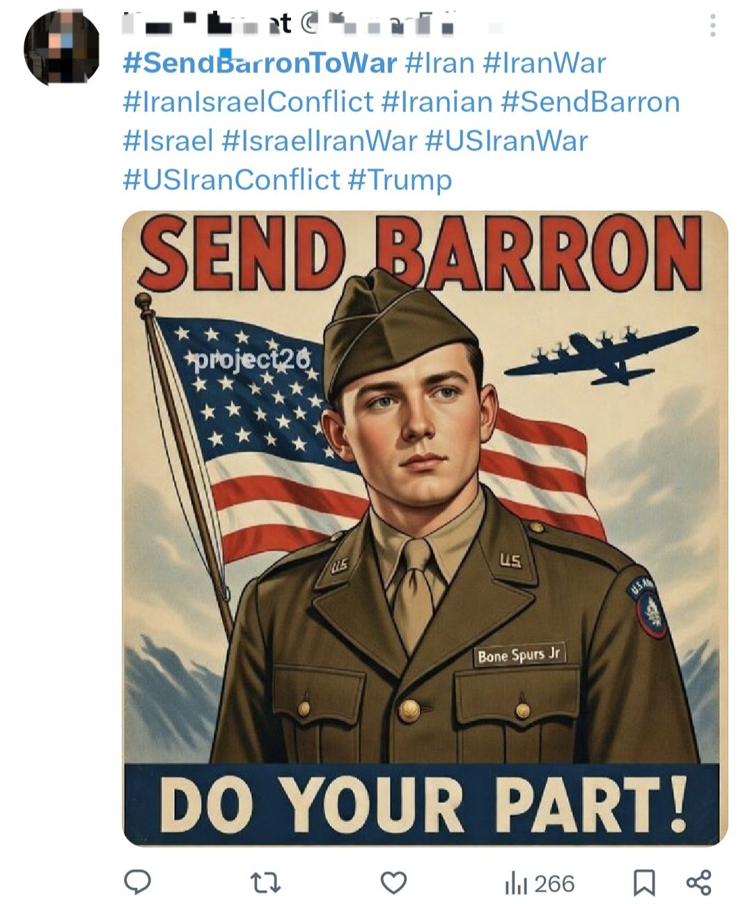 도널드 트럼프 미국 대통령의 막내 아들 배런 트럼프의 입대를 촉구하는 ‘SendBarron(배런을 보내라)’ 해시태그가 온라인에서 확산했다.2일(현지 시간) 미국 데일리비스트는 소셜미디어를 중심으로 트럼프 대통령의 막내 아들인 배런 트럼프의 입대를 촉구하는 해시태그가 퍼졌다고 전했다.보도에 따르면 미국과 이스라엘이 이란을 공격한 이후 미군 사망자가 발생하자 온라인에선 전쟁이 정당하다면 왜 대통령의 막내 아들은 참전하지 않느냐는 주장이 제기됐다.이와 함께 SendBarron(배런을 보내라)는 해시태그도 확산했다. 해시태그가 달린 게시물에는 백악관에 거주하며 뉴욕대학교 워싱턴 D.C. 캠퍼스에 재학 중인 배런 트럼프도 전쟁에 나서야 한다는 주장이 담겼다.4일 미국 USA투데이에 따르면 ‘배런 트럼프를 징집하라’는 의미의 풍자 웹사이트 DraftBarronTrump.com도 등장했다. 미국의 코미디언이자 작가인 토비 모턴이 사이트를 개설한 것으로 전해졌다.해당 사이트에는 트럼프