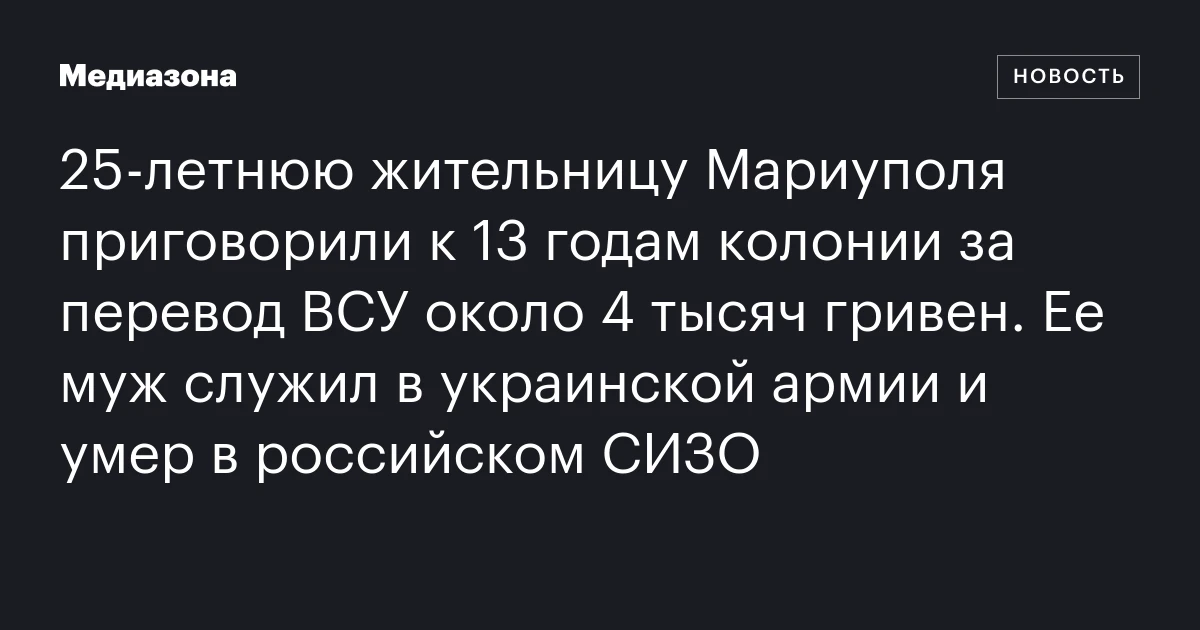25‑летнюю жительницу Мариуполя приговорили к 13 годам колонии за перевод ВСУ около 4 тысяч гривен. Ее муж служил в украинской армии и умер в российском СИЗО