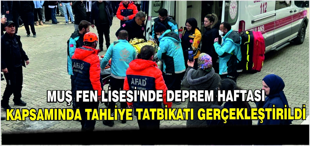 Muş İl Milli Eğitim Müdürlüğü İş Sağlığı ve Güvenliği Birimi koordinasyonunda, Muş Devlet Hastanesi, Muş Belediyesi İtfaiyesi, UMKE ve AFAD birimlerinin katılımıyla Muş Fen Lisesi’nde deprem haftası kapsamında tahliye tatbikatı gerçekleştirildi.