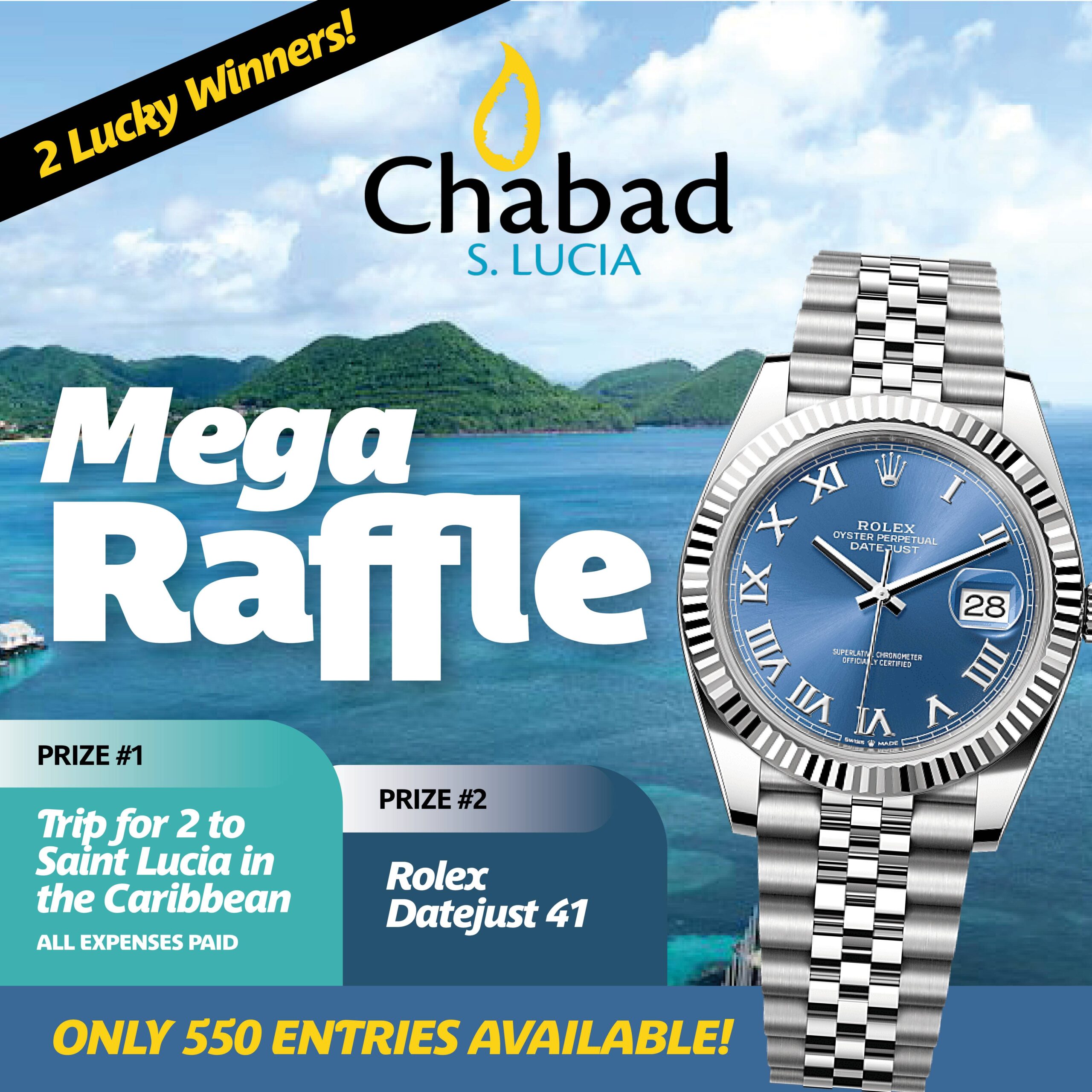 ⌚ MEGA RAFFLE ALERT! ⌚Two incredible prizes. Two lucky winners. YOUR TICKET CAN BE AS LOW AS $1 ️ Trip for 2 to St. Lucia – ALL expenses paid!⌚ Rolex Datejust 41! Support Chabad of St. Lucia and you could be packing your bags…or wearing a Rolex ️ ENTER NOW: https://www.charidy.com/chabadslraffle