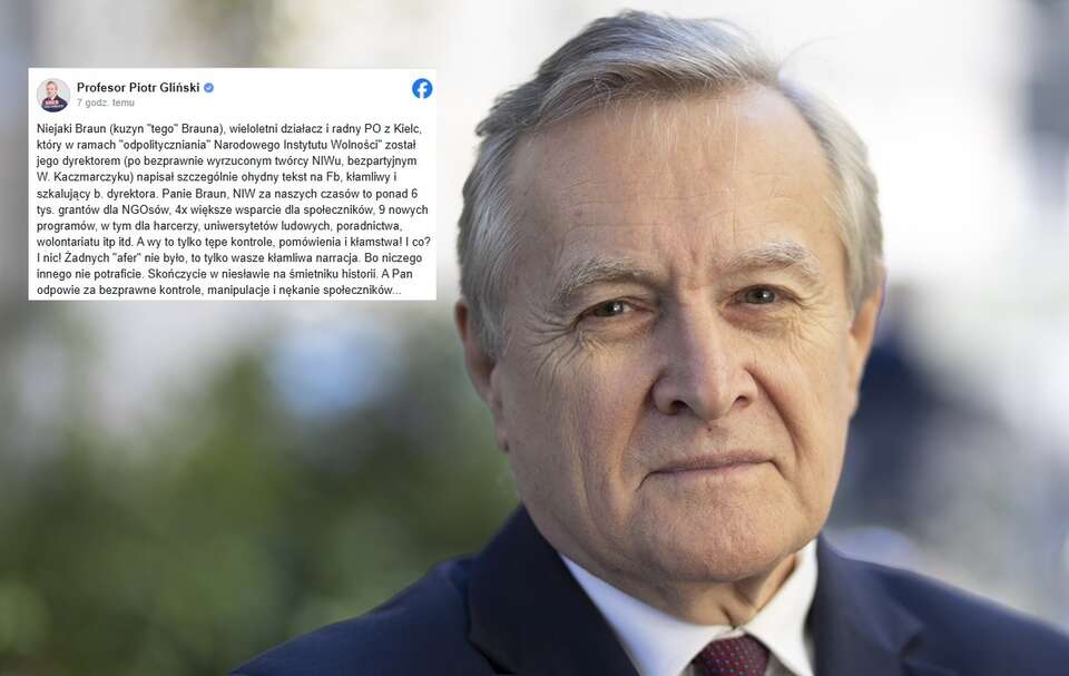 Trwa nagonka na byłego szefa NIW Wojciecha Kaczmarczyka. Na atak Michała Brauna zareagował profesor Piotr Gliński. "Skończycie w niesławie na śmietniku historii. A Pan odpowie za bezprawne kontrole, manipulacje i nękanie społeczników" - wskazał.