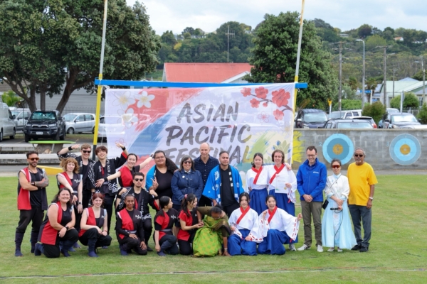 2026年3月1日, 新西兰旺加努伊举行了首届亚洲太平洋文化节,旺加努伊市长Andrew Tripe、国会议员Carl Bates、主办方朗伊蒂凯-旺加努伊跨区多元文化理事会成员与部分表演团体成员合影。 (王星苏/大纪元)
