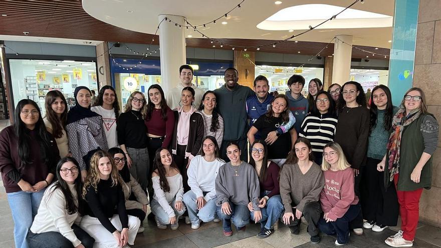 Las voluntarias que ayer tarde comenzaron a trabajar en la elaboración de las bolsas recibieron una visita inesperada. El jugador del UCAM Murcia Dylan Ennis, que es muy querido por todos los aficionados al baloncesto allá donde juega, estuvo un rato con el equipo de trabajo y no dudó en fotografiarse y charlar unos minutos con las jóvenes, interesándose por la Carrera de la Mujer de este domingo.