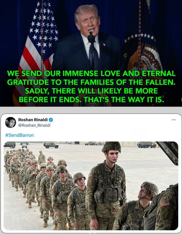 지난달 28일부터 시작된 미국의 이란 공습 과정에서 6명의 미군이 사망해 미국 내 여론이 악화하고 있는 가운데 도널드 트럼프 미국 대통령의 3남 2녀 중 막내인 배런(20)을 군대로 보내라는 주장이 일각에서 나온다. 온라인에서는 배런이 군복을 입은 모습을 인공지능(AI)으로 생성한 여러 개의 합성 이미지가 유행하고 있다. ‘#SendBarron(배런을 보내라)’이라는 해시태그 등도 X, 레딧 등 주요 소셜미디어에서 빠르게 번지고 있다. 배런의 입대를 촉구하는 패러디 사이트도 생겨났다.배런에 대한 징집 요구는 공습 둘째 날인 1일 트럼프 대통령이 트루스소셜에 올린 영상 발언에서 촉발됐다. 당시 트럼프 대통령은 전사한 미군들을 애도하며 “슬프지만 (이번 전쟁이) 끝나기 전에 더 많은 (미군) 희생이 있을 것 같다. (전쟁이란 게) 원래 그렇다”고 말해 여론의 반발을 샀다. 트럼프 대통령의 무덤덤한 말투와 ‘원래 그렇다’는 표현에 대해 공감력이 떨어지는 무례한 발언이란 비판이 쏟아진 것이