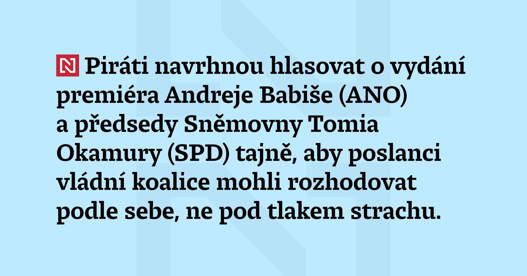 Piráti navrhnou hlasovat o vydání premiéra Andreje Babiše (ANO) a předsedy Sněmovny Tomia Okamury (SPD) tajně, aby poslanci vládní koalice mohli rozhodovat podle sebe, ne pod tlakem strachu. Před zahájením sněmovní schůze to řekl předseda Pirátů Zdeněk Hřib. Postoj k žádostem o vydání předsedů stran je podle opozice součástí koaličních dohod a tlak na koaliční poslance je tak podle Hřiba […]