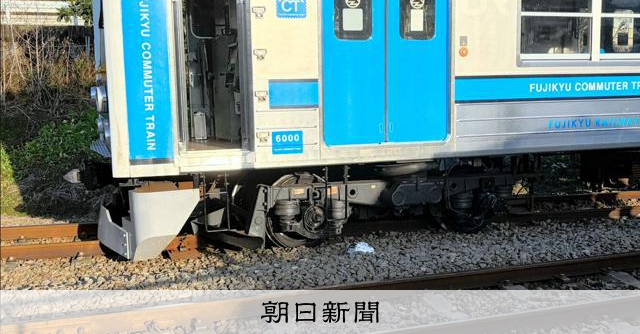富士急行の先頭車両が脱線、乗員乗客45人にけがなし 山梨県都留市 5日午後2時半ごろ、山梨県都留市の田野倉駅近くで、富士急行線の上り河口湖発大月行き普通列車(3両編成)が脱線した。乗客42人と乗員3人の計45人にけがはなかった。