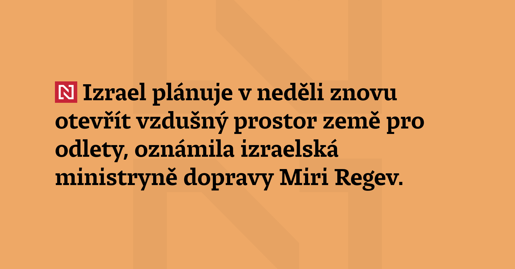 Izrael plánuje v neděli znovu otevřít vzdušný prostor země pro odlety, oznámila izraelská ministryně dopravy Miri Regev. „Po vyhodnocení situace jsme se rozhodli otevřít od neděle vzdušný prostor pro odlety, a to v závislosti na bezpečnostním vývoji,“ řekla Regev. „Informace budeme aktualizovat v průběhu dne.“ (ToI)