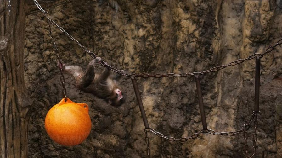 Изображения на Пънч, който влачи играчка, по-голяма от него, привлякоха вниманието на посетителите на зоологическа градина близо до Токио