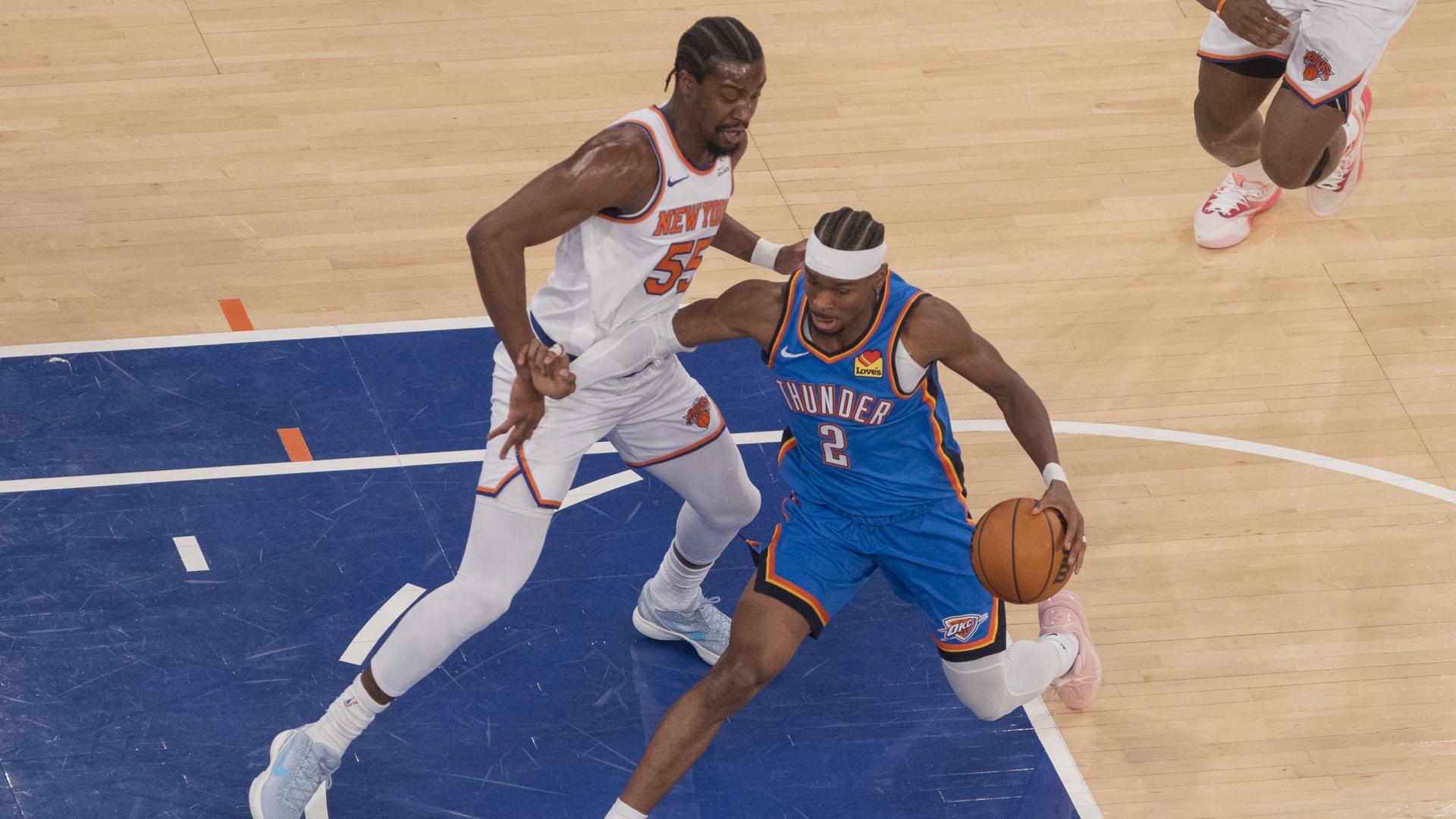 Los Oklahoma City Thunder se llevaron este miércoles un partido muy ajustado en casa de los New York Knicks por 100-103 y consiguieron su octava victoria consecutiva en el Madison Square Garden. Jeremy Sochan y Landry Shamet tuvieron en sus manos el 103-103 que hubiera forzado la prórroga en los últimos seis segundos del partido, pero los jugadores de los Knicks no acertaron y el Madison Square Garden vio cómo OKC ganaba en Manhattan por octava vez consecutiva. Chet Holmgren fue el máximo anotador de la noche con 28 puntos y un decisivo 6 de 11 en triples. El canadiense Shai Gilgeous-Alexander sumó otro partido (124) más en su camino particular para acercarse a un récord que parecía imposible de alcanzar: los 126 partidos seguidos con 20 o más puntos de Wilt Chamberlain entre 1961 y 1963. Pese a que la reacción tardó en llegar tras el descanso, los Knicks plantaron cara al campeón y compitieron de tú a tú en los últimos minutos del tercer cuarto, con un Karl-Anthony Towns dominante. El dominicano contribuyó con un doble-doble (17 puntos y 17 rebotes), además de una asistencia. Los Charlotte Hornets arrollaron este miércoles 118-89 a los Boston Celtics en el TD Garden y cortaron el buen momento del equipo de Joe Mazzulla, en el que el español Hugo González sumó ocho puntos, seis rebotes y una asistencia. Kon Knueppel lideró a los Hornets con 20 puntos, apoyado por los 18 de LaMelo Ball y los 18 de Brandon Miller. Para Boston, el máximo anotador fue Derrick White con 29 puntos, mientras que Jaylen Brown aportó 20 puntos, 11 rebotes y 7 asistencias. Los Philadelphia 76ers ganaron al colista (106-102), los Utah Jazz, con un gran partido de Tyrese Maxey, que sumó 25 puntos y 6 asistencias, y con Jabari Walker irrumpiendo con 22 puntos y 10 rebotes. Por parte de los Jazz, fue su séptima derrota consecutiva. El mejor fue Keyonte George con 30 puntos y 4 rebotes. Los Portland Trail Blazers reforzaron sus posibilidades de subir puestos en el play-in tras vencer a los Memphis Grizzlies (122-114). Jrue Holiday se convirtió en el cuarto jugador en la historia de la NBA con un partido de más de 30 puntos, más de 10 asistencias, más de 5 rebotes y más de 5 triples anotados teniendo 35 años o más, firmando 35 puntos, 11 asistencias y 5 rebotes. Por parte de los Grizzlies, fue su segunda derrota consecutiva en un equipo plagado de lesiones, donde el mejor fue Jaylen Wells con 24 puntos y 3 rebotes. Los Atlanta Hawks ganaron su quinto partido consecutivo (131-113) gracias a un gran Onyeka Okongwu, que firmó 21 puntos, 8 rebotes y 3 robos, además de la ayuda de Jalen Johnson con 20 puntos, 5 rebotes y 9 asistencias. Por parte de los Milwaukee Bucks, Giannis Antetokounmpo, intentando recuperar su mejor estado de forma, sumó 24 puntos, 5 rebotes y 4 asistencias, aunque terminó con un -24 en pista. Los Angeles Clippers sumaron su tercera victoria consecutiva (130 - 107), con Kawhi Leonard a un nivel extraordinario tras anotar 29 puntos y capturar 8 rebotes, con la ayuda de Bennedict Mathurin, que aportó 23 puntos, 8 rebotes y 4 asistencias. Por parte de los Indiana Pacers, sumaron su séptima derrota consecutiva, en un partido donde el mejor fue Pascal Siakam con 29 puntos y 5 rebotes.