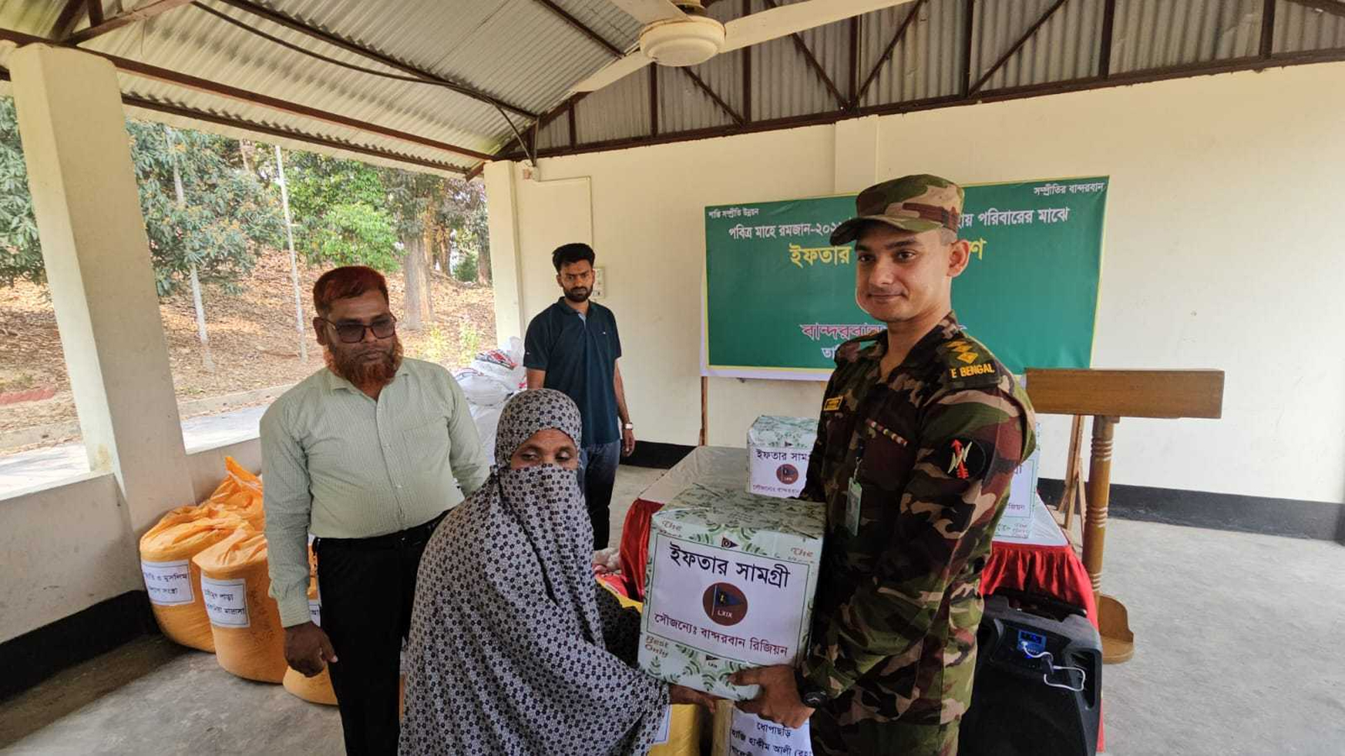 পাহাড়ে নিরাপত্তা প্রদানের পাশাপাশি মানবিক কার্যক্রমেও গুরুত্বপূর্ণ ভূমিকা রেখে আসছে বাংলাদেশ সেনাবাহিনী।এরই ধারাবাহিকতায় বান্দরবান রিজিয়নের উদ্যোগে দরিদ্র ও অসহায় মানুষের মাঝে ইফতার সামগ্রী বিতরণ করা হয়েছে। একই সঙ্গে সম্প্রতি অগ্নিকান্ডে শহরের উজানীপাড়া এলাকায় ভয়াবহ অগ্নিকাণ্ডে ক্ষতিগ্রস্ত পরিবারের মাঝে নগদ অর্থ সহায়তাও দেয়া হয়। বৃহস্পতিবার (৫ মার্চ) দুপুরে এমডিএস মাঠে এসব ইফতার সামগ্রী ও নগদ অর্থ দেন ৬৯ পদাতিক ব্রিগেডের জি থ্রি আই ক্যাপ্টেন সামিউল ইসলাম।এ সময় জি থ্রি আই ক্যাপ্টেন সামিউল ইসলাম বলেন, পার্বত্য এলাকায় শান্তি-শৃঙ্খলা রক্ষার পাশাপাশি মানবিক সহায়তার কার্যক্রম অব্যাহত রেখেছে বাংলাদেশ সেনাবাহিনী। সমাজের অসহায় ও দুস্থ মানুষের পাশে দাঁড়িয়ে মানবিক সহায়তা দিয়ে যাচ্ছি। আগামীতেও এ ধরনের উদ্যোগ অব্যাহত থাকবে বলে জানান সেনাবাহিনীর এই কর্মকর্তা।আরও পড়ুন: বান্দরবানে আগ্নেয়াস্ত্রসহ ইউপিডিএফ কর্মী আটকঅনুষ্ঠানে ১০০টি পরিবার ও এতিমখানার মাঝে চাল, ডাল, তেল, ছোলা, খেজুরসহ নিত্যপ্রয়োজনীয় খাদ্যসামগ্রী দেয়া হয়। এছাড়াও অগ্নিকান্ডে ক্ষতিগ্রস্ত কয়েকটি পরিবারের হাতে নগদ অর্থ সহায়তা দেয়া হয়।এদিকে সহায়তা পেয়ে উপকারভোগীরা সেনাবাহিনীর প্রতি কৃতজ্ঞতা প্রকাশ করেন। তারা বলেন, এই সহযোগিতা তাদের জন্য অনেক সহায়ক হবে এবং কঠিন সময়ে সেনাবাহিনী পাশে থাকায় তারা স্বস্তি পেয়েছেন।